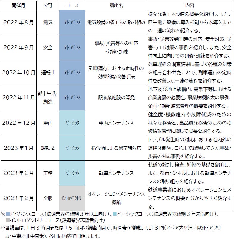 また、2022年3月に初回のオンライン講座(運転:列車運行における定時性の効果的な改善手法)を開催したところ、12か国34名の方にご参加いただき、当社の取り組みに対して高い関心をお持ちいただきました。