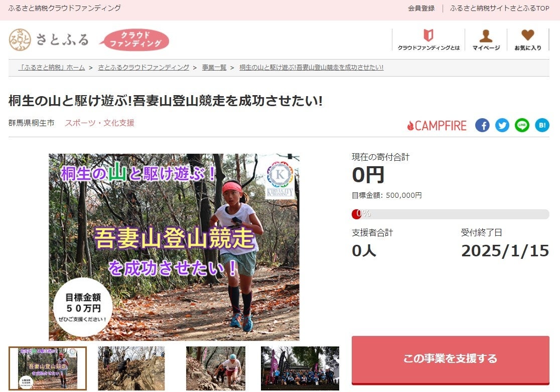 群馬県桐生市とふるさと納税ポータルサイト「さとふる」を運営する株式会社さとふる(本社:東京都中央区、代表取締役社長 兼 CEO:藤井 宏明)は、「さとふるクラウドファンディング」にて、「桐生の山と駆け遊ぶ!吾妻山登山競走を成功させたい!」の寄付受け付けを2024年10月15日より開始します。