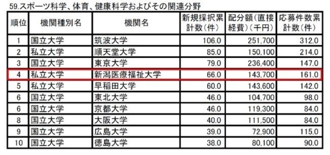 2022年1月に文部科学省が発表した「令和3年度(2021年度)科学研究費採択件数(過去4年間の新規採択の累計数)」において、「スポーツ科学、体育、健康科学、およびその関連分野(リハビリテーション科学を含む)」で、本学は全国第4位となりました(私立大学では第2位)。