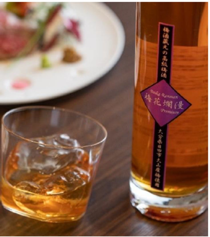 「梅花爛漫(ばいからんまん)」は、梅酒蔵おおやまが誇る2種の熟成梅酒――「3年熟成ゆめひびき」と「樽仕込高級梅酒ゆめひびき」を独自の比率でブレンドした、プレミアムな一本です。