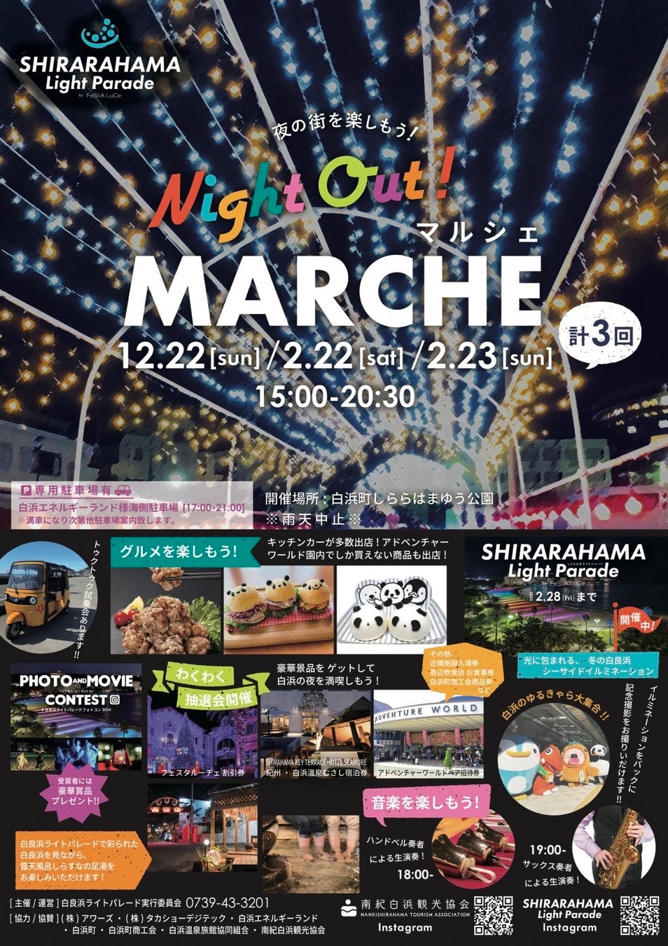 アドベンチャーワールド(和歌山県白浜町)は、白良浜シーサイドイルミネーション「SHIRARAHAMA LIGHT PARADE by FeStA LuCe」の一環として開催される「Night Out! MARCHE」に出店いたします。 「白良浜シーサイドイルミネーション SHIRARAHAMA LIGHT PARADE by FeStA LuCe」は、白浜の冬を彩る特別なイベントとして、延長620mにおよぶライトアップで白良浜を鮮やかに照らし、現在は期間限定でクリスマスカラーに演出されています。