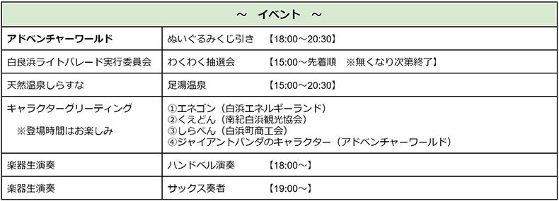 白良浜シーサイドイルミネーション「SHIRARAHAMA LIGHT PARADE by FeStA LuCe」アドベンチャーワールドは白浜の冬を彩る「Night Out! MARCHE」に出店します