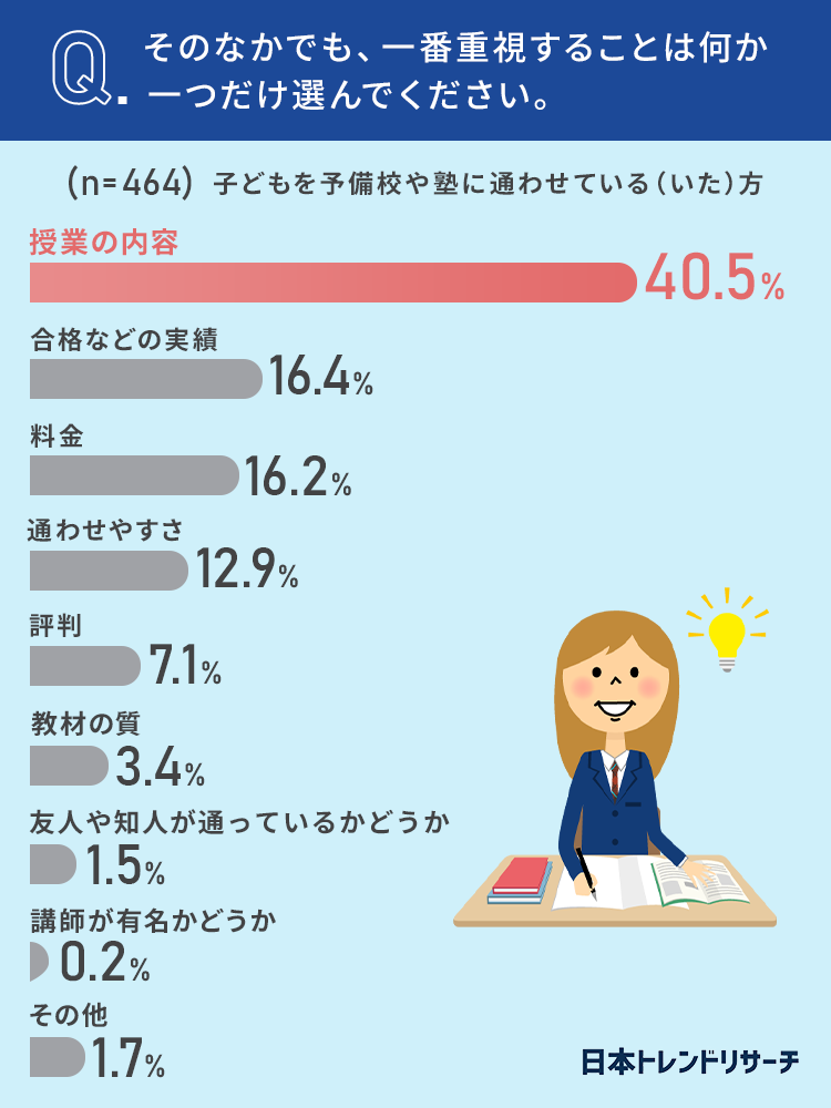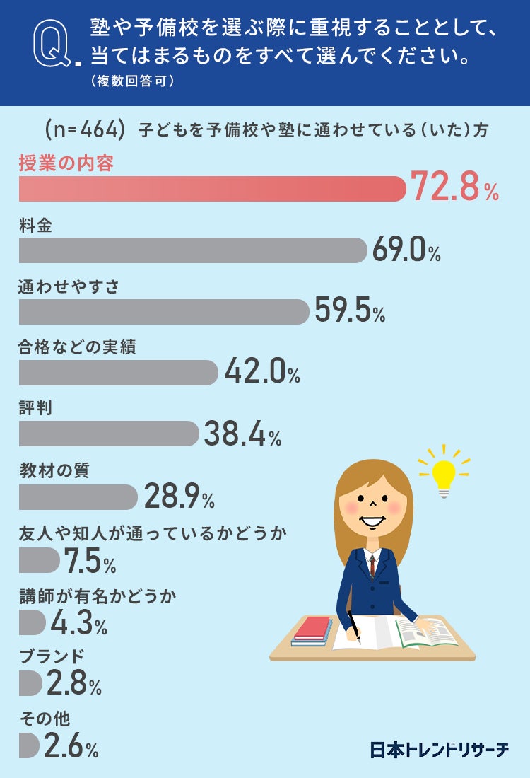 「授業の内容」が72.8%、続いて「料金」が69.0%で「通わせやすさ」が59.5%と続きました。