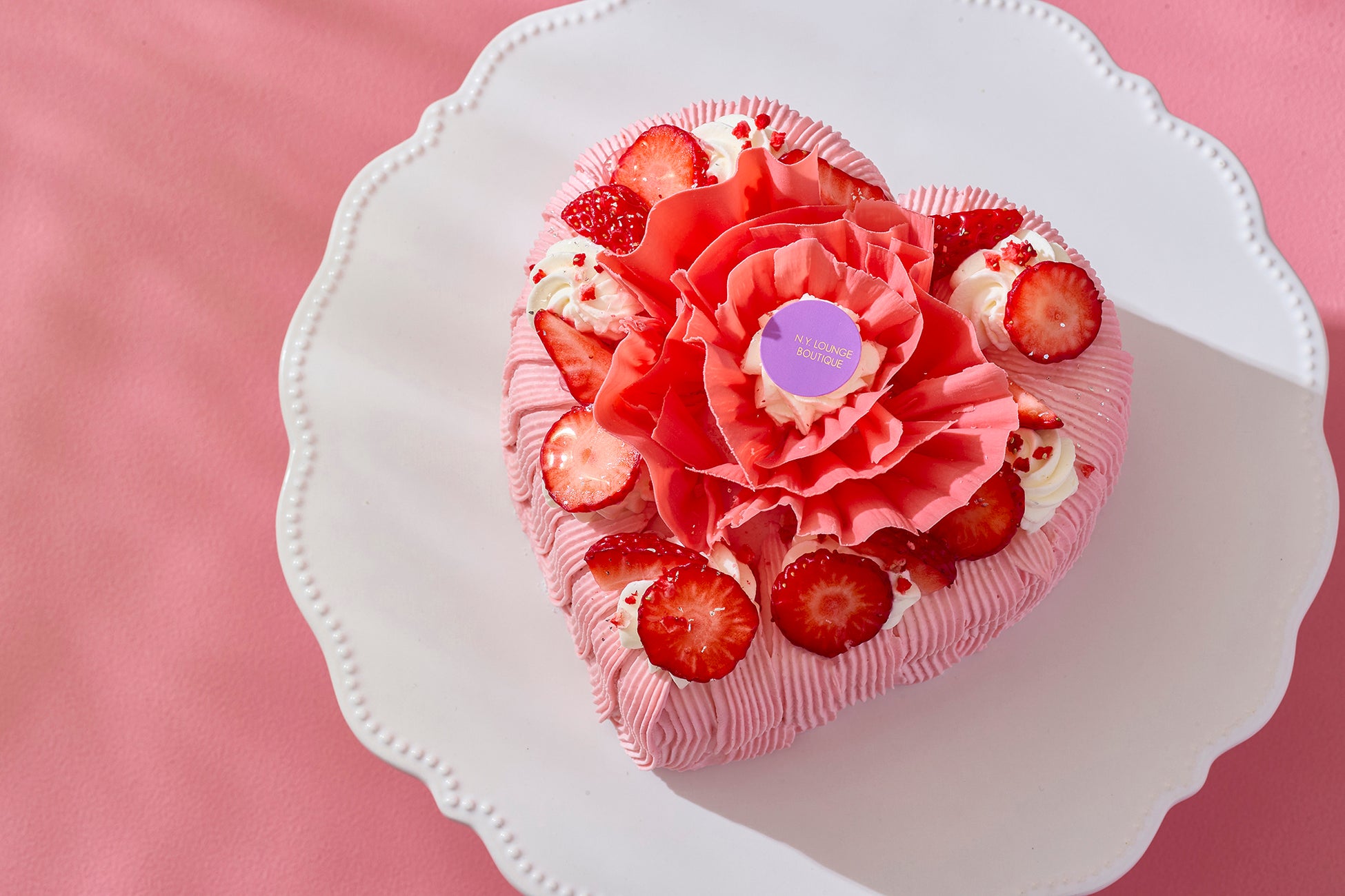 愛らしいハート型が目を惹く母の日ケーキは、ローズが上品に香る淡いピンク色のローズストロベリーシャンティーで美しくデコレーションを施し、トップには「感謝」という花言葉を持つピンクのカーネーションを模したチョコレートをあしらってフォトジェニックな装いにしました。
