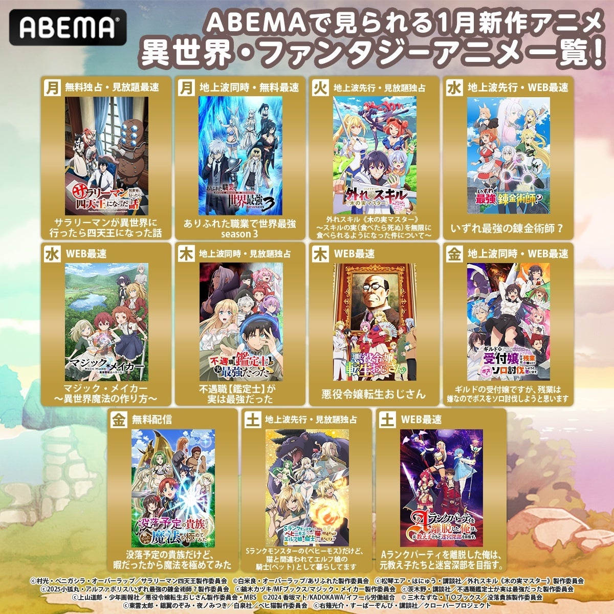 ほかにも「ABEMA」では、地上波先行で配信をスタートする『いずれ最強の錬金術師?』をはじめ、『悪役令嬢転生おじさん』『Aランクパーティを離脱した俺は、元教え子たちと迷宮深部を目指す。』『マジック・メイカー ~異世界魔法の作り方~』の4作品をWEB最速配信するほか、『ギルドの受付嬢ですが、残業は嫌なのでボスをソロ討伐しようと思います』の地上波同時・WEB最速放送、『没落予定の貴族だけど、暇だったから魔法を極めてみた』の無料放送など、2025年冬アニメ注目作品の無料放送や先行配信が続々と決定中です。また、現在絶賛配信中の『ありふれた職業で世界最強 season 3』も引き続き地上波同時・無料最速でお楽しみいただけます。