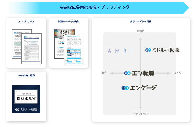 プレスリリースや特設ページ、Web広告での告知に加え、各求人サイトでの集客支援を実施。『エン転職』『エンゲージ』『AMBI』『ミドルの転職』とターゲットの異なる求人サイトを活用することで、ターゲットへ網羅的に求人を届けます。