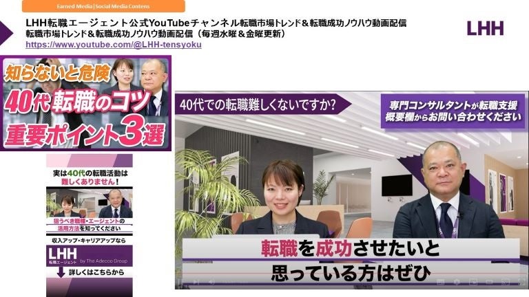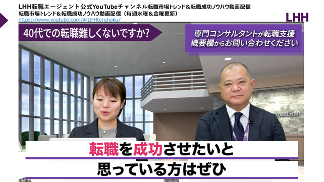 2024年4月3日より、LHH転職エージェント公式YouTubeチャンネルで、毎週水曜日と金曜日に、LHH転職エージェント所属のコンサルタントが転職ノウハウについて語る番組を開始します。転職したいと考える方が1,000万人を超え、定年の引き上げで仕事に就いている期間が長くなる方も増加するなか、キャリアに悩む30代・40代・50代のビジネスパーソンに向け、転職市場のトレンドや転職を成功させるためのノウハウなどを、これまで数多くの働き手を支援してきたベテランコンサルタントと気鋭の若手コンサルタントが、わかりやすくお伝えするプログラムを配信します。