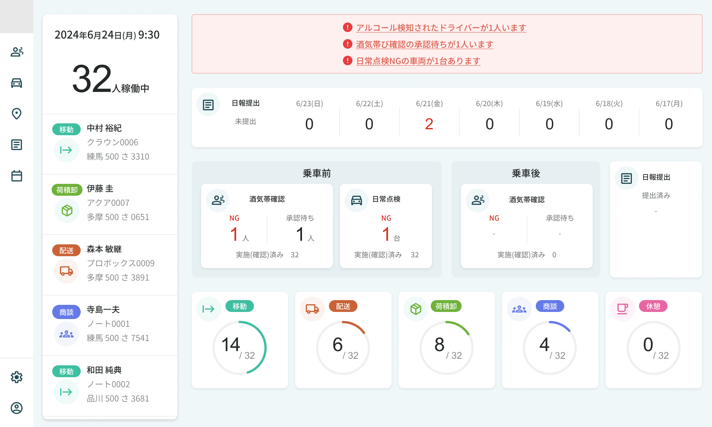 道路交通法で定められた“安全運転管理業務”に特化したクラウドサービス。アルコールチェックや運転日報など日常の安全運転管理業務を一元管理できる、安全運転管理者向けのサービスです。
