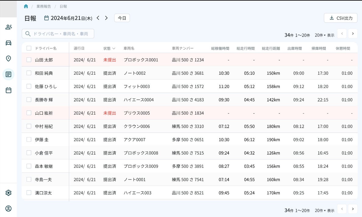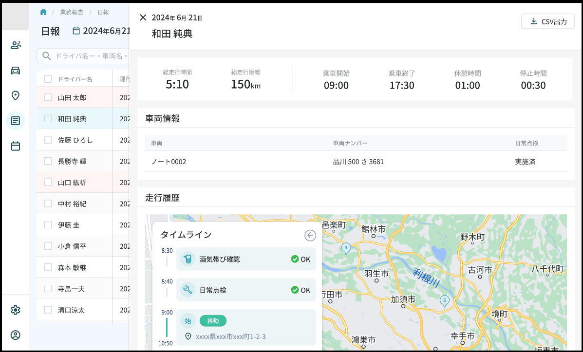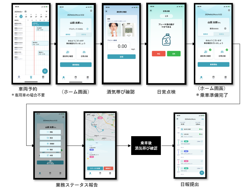 (車両予約→酒気帯び確認→日常点検→業務ステータス報告→日報提出)