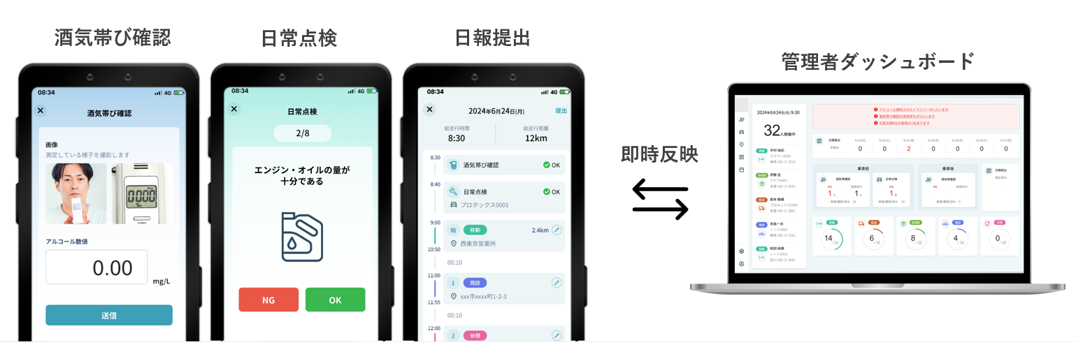 ・ドライバーは、スマートフォンの画面表示に沿ってタップ・入力するだけで日常業務が完了