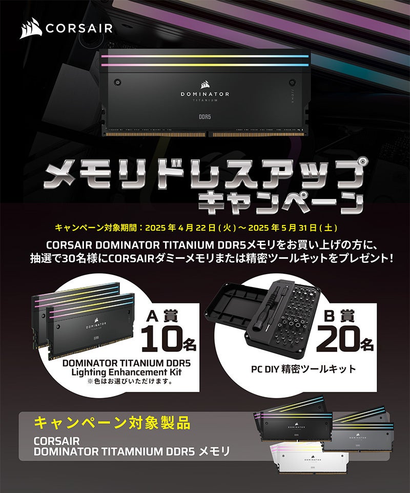 株式会社アスク(本社:東京都千代田区)は、2025年4月22日(火)~5月31日(土)までの期間、CORSAIR DOMINATOR TITANIUM DDR5メモリをご購入いただいた方を対象に、抽選で豪華景品が当たるキャンペーンを実施いたします。