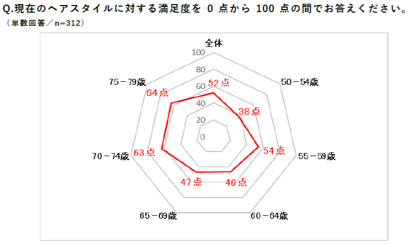 現在のヘアスタイルに対して点数をつけていただいたたところ、全体の平均は52点となりました。50-54歳の平均は38点と、他の年代と比較しても満足していない方が多いことが分かります。一方で70代は60点を超えており、50代や60代に比べるとヘアスタイルに満足している方が多いことが分かります。