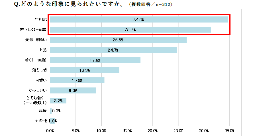どのような印象に見られたいか尋ねたところ、「年相応」(34.6%)、「若々しく」(31.4%)が上位となり、印象では年齢を重視している方が多いことが分かりました。次いで、「元気、明るい」(26.6%)、「上品」(24.7%)といった雰囲気に関する印象が続きました。