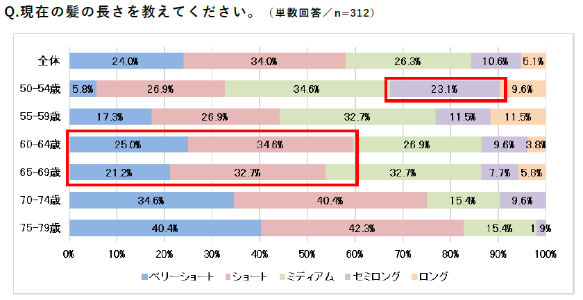 また、全体では「セミロング」と回答した方はわずか10.6%でしたが、50-54歳のみ23.1%と他の年代と比較しても2倍以上多いことも特徴的な結果となりました。