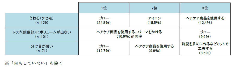 現状の髪型で満足いかない点で上位3位であった「うねる」「トップにボリュームが出ない」「分け目が薄い」に対しては、「うねる」ではアイロン(15.5%)、「トップにボリュームが出ない」ではパーマ(10.9%)、「分け目が薄い」では前髪を多めに作るなどカットで工夫する(8.5%)など、お悩みに沿った対処をしていることが分かりました。