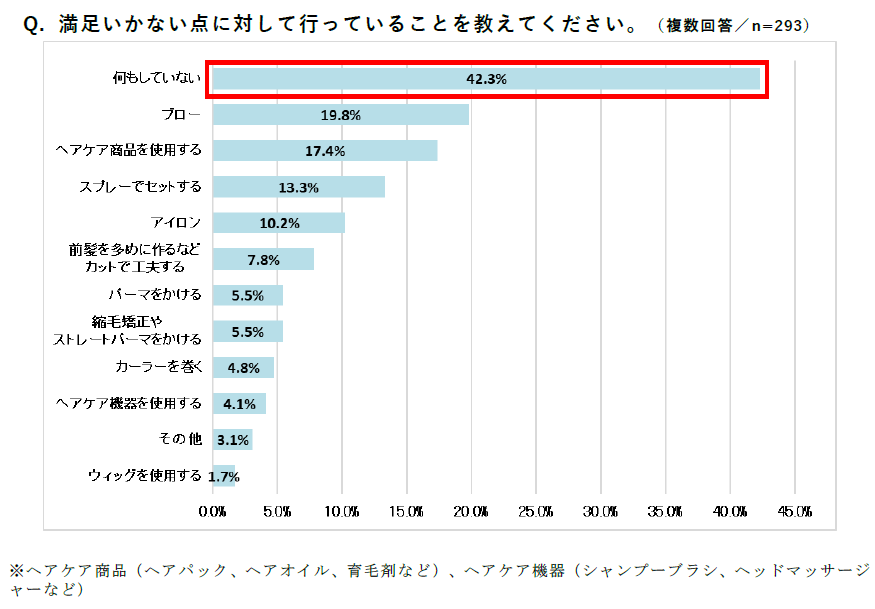 また、満足いかない点に対して行っていることを尋ねたところ、何もしていない(42.3%)が最も多い回答となり、満足をしていなくても対処をしていない方が多いことが分かります。対処をしている方では、「ブロー」(19.8%)、「ヘアケア商品を使用する」(17.4%)、「スプレーでセットする」(13.3%)が上位となりました。