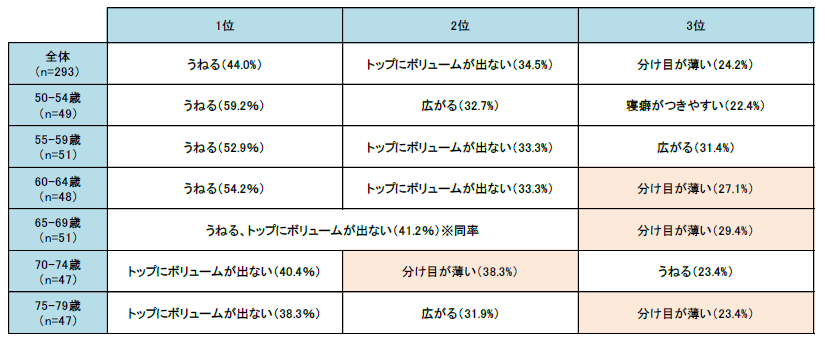 また、55-59歳から「トップにボリュームが出ない」が2位に入っており、60代からは3位にも「分け目が薄い」がランクインしていることから、60代から薄毛が気になり始める傾向が顕著に現れています。