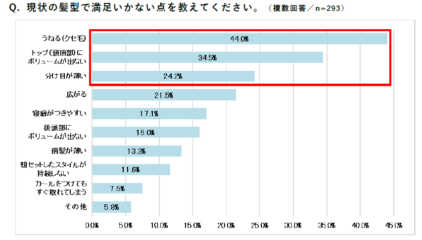 前問でヘアスタイルに対する満足度を100点と回答した方以外に、現状の髪型で満足いかない点を尋ねたところ、「うねる」(44.0%)が最も多い回答となり、次いで「トップにボリュームが出ない」(34.5%)、「分け目が薄い」(24.2%)が続きました。