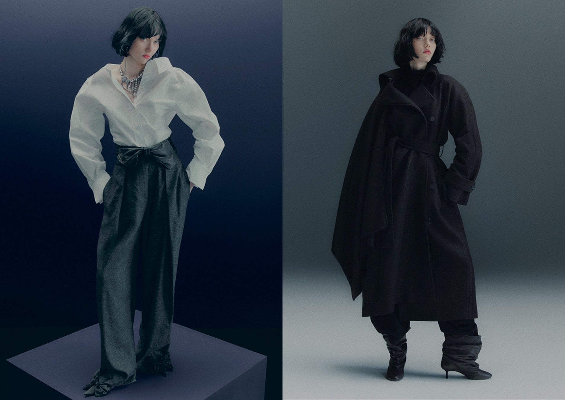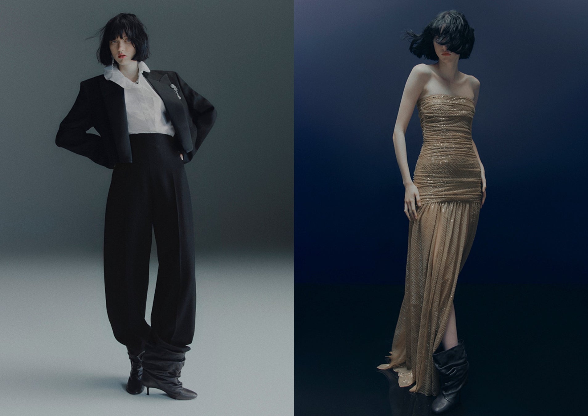 今季はシャツスタイルも欠かせない存在です。白のクラシックなタキシードシャツは、大きく開いた襟元とカットアウトされたショルダーで再解釈され、存在感のあるネックレスやイヤリングを引き立てるデザインに進化させました。フリル付きのハイネックのシャツは、タキシード風の胸元切り替えと深めのカフスを備え、エレガントなムードを漂わせます。