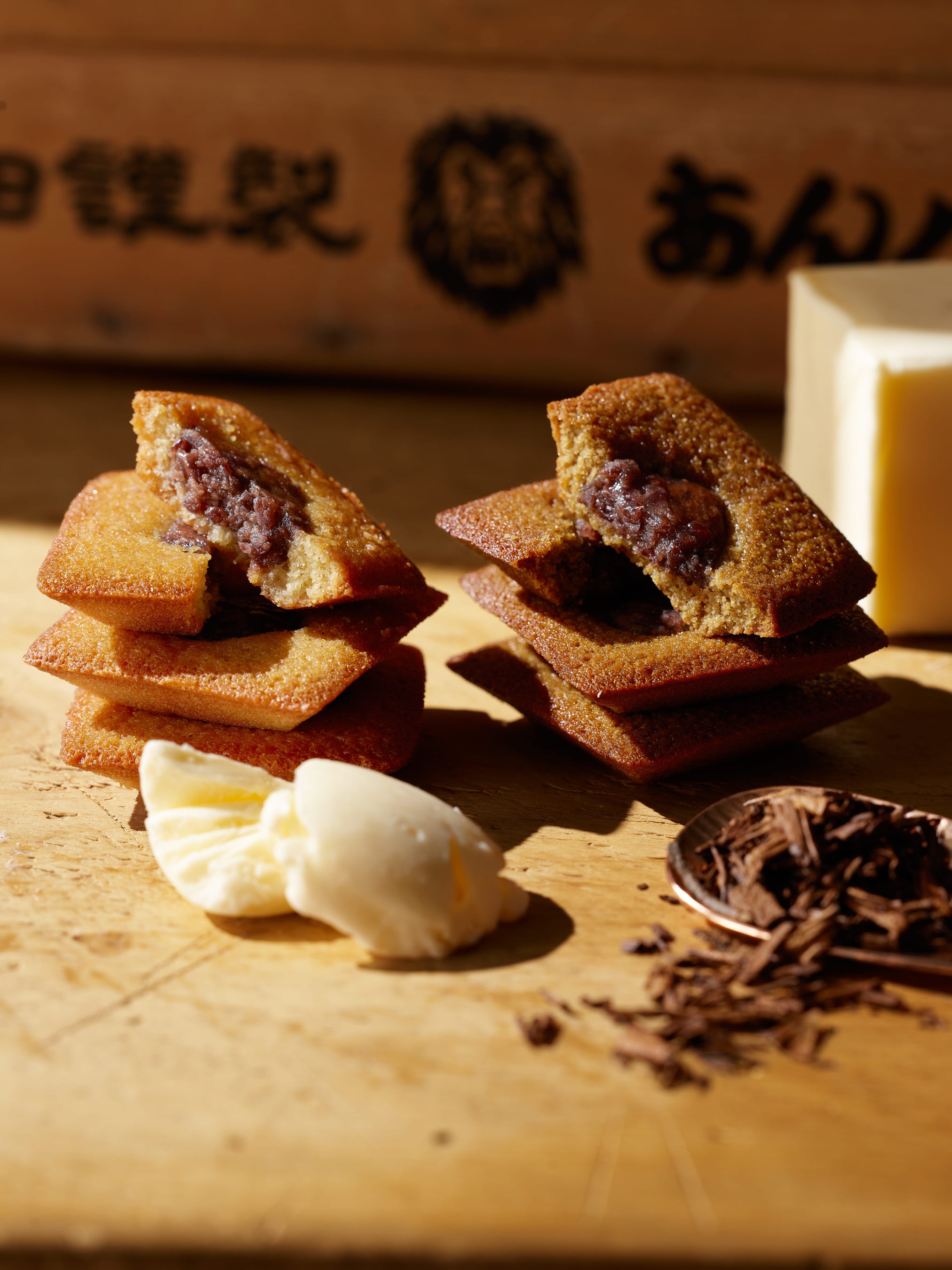『ほうじ茶』と丁寧に焦がしたバターを練り込んだフィナンシェ生地で、岡田謹製、希少な北海道千歳産『えりも小豆』餡子を包み込んだ。