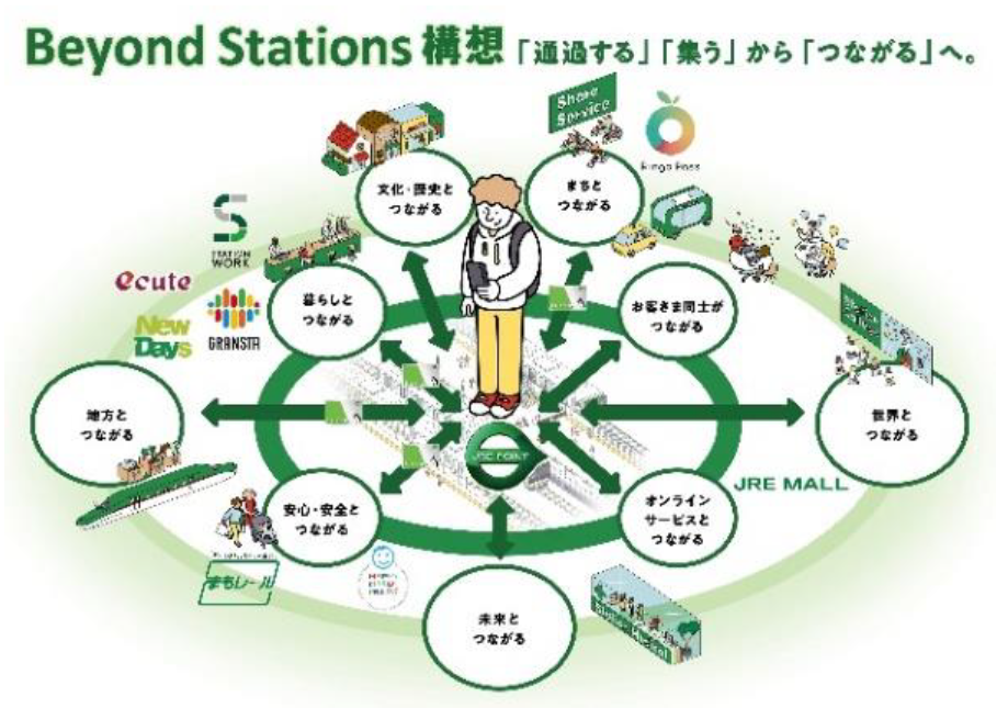 ヒトの生活における「豊かさ」を起点として、リアルの交流拠点である駅の強みを活かしながら駅空間の配置と機能を変革するとともに、JRE POINT生活圏の拡充を通じ、駅を「交通の拠点」から「暮らしのプラットフォーム」へと転換します。