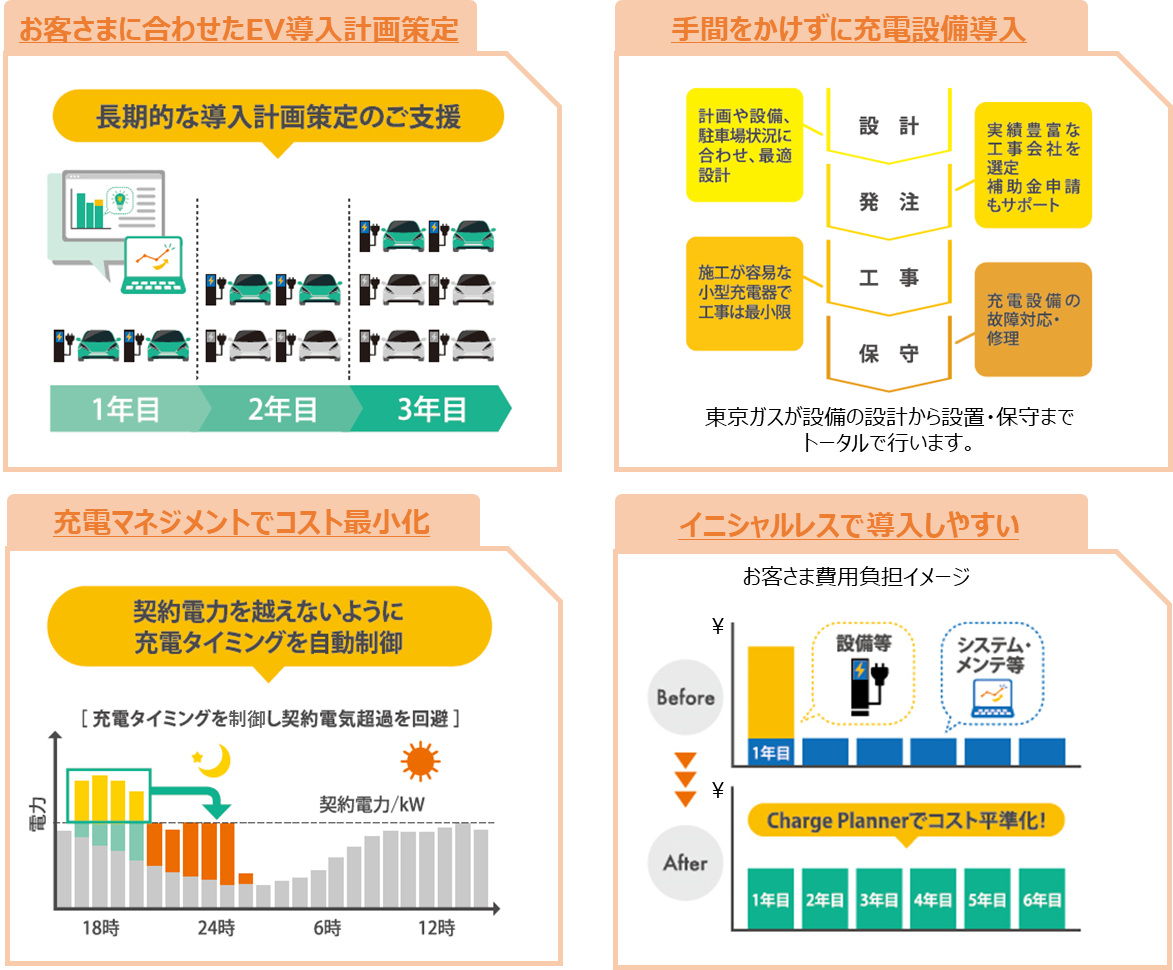 EV充電設備の導入にかかる初期費用を東京ガスが負担し、月々のサービス料金としてご提供することで、導入コスト平準化を図ることが可能です。