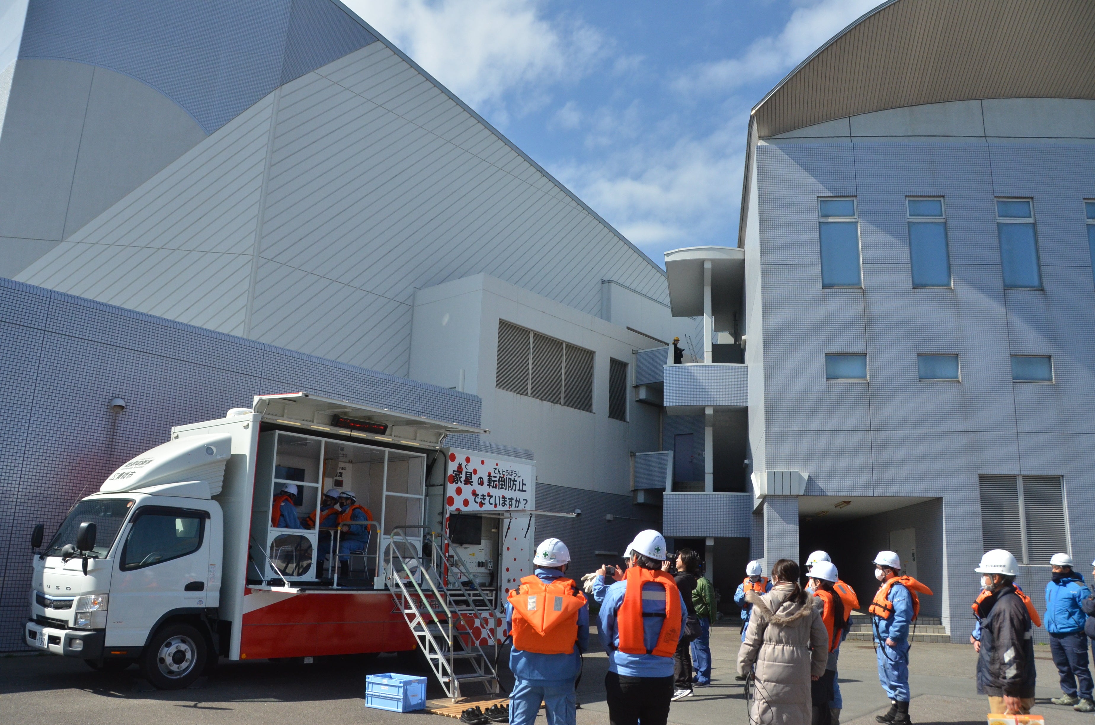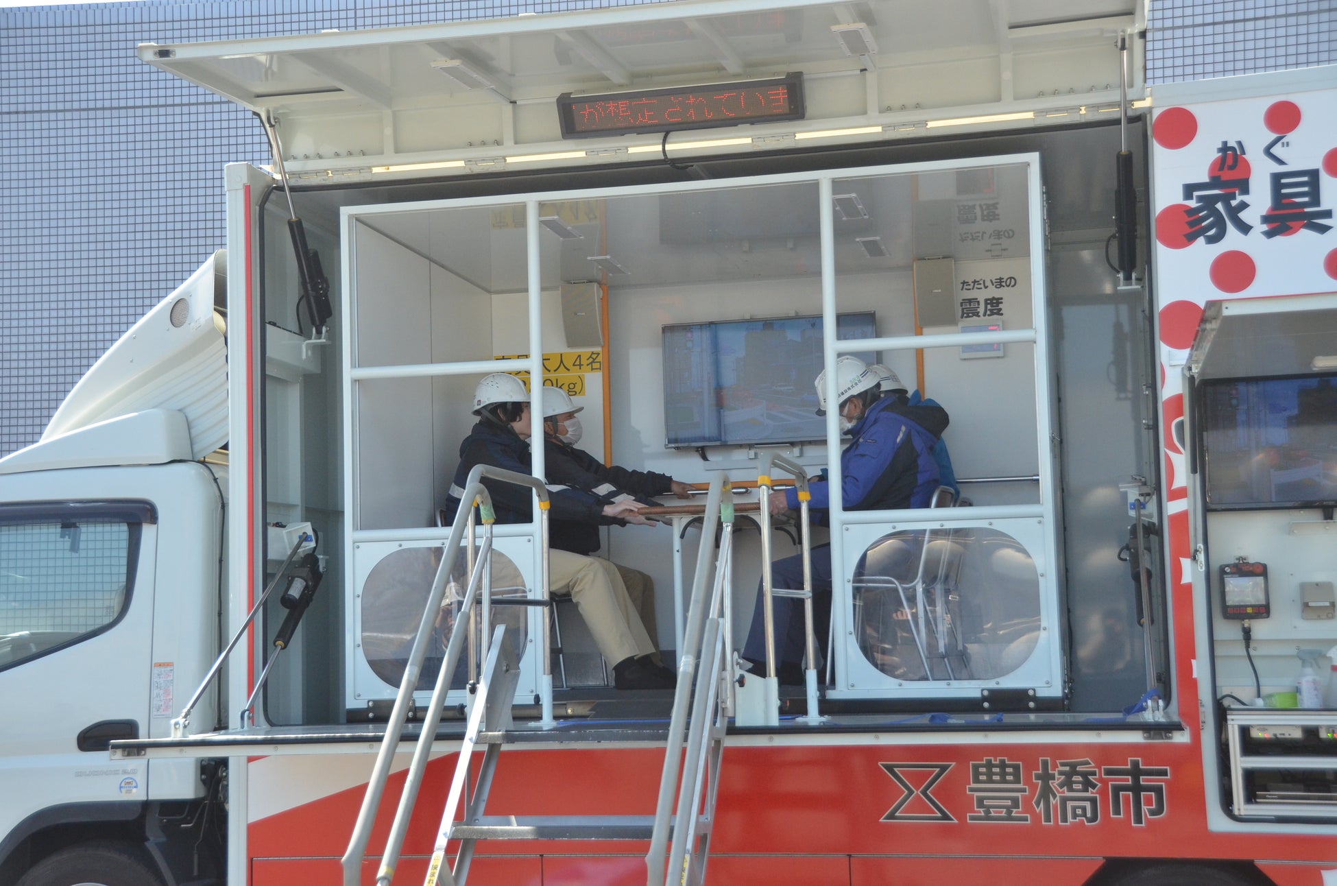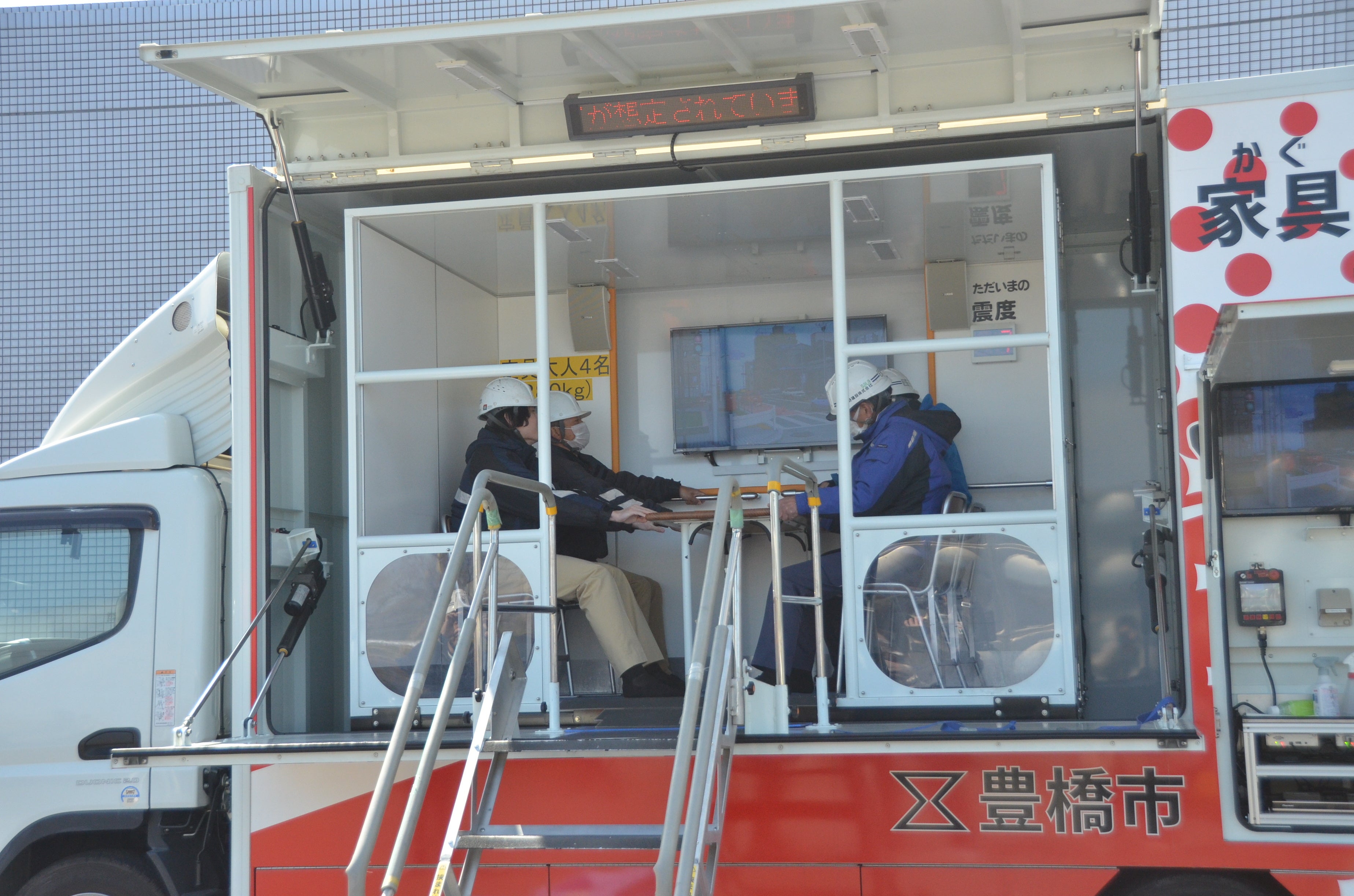 屋外階段の近くには起震車が用意され、参加者は震度7の激しい揺れを体験。地震の恐ろしさを改めて肌で感じていました。