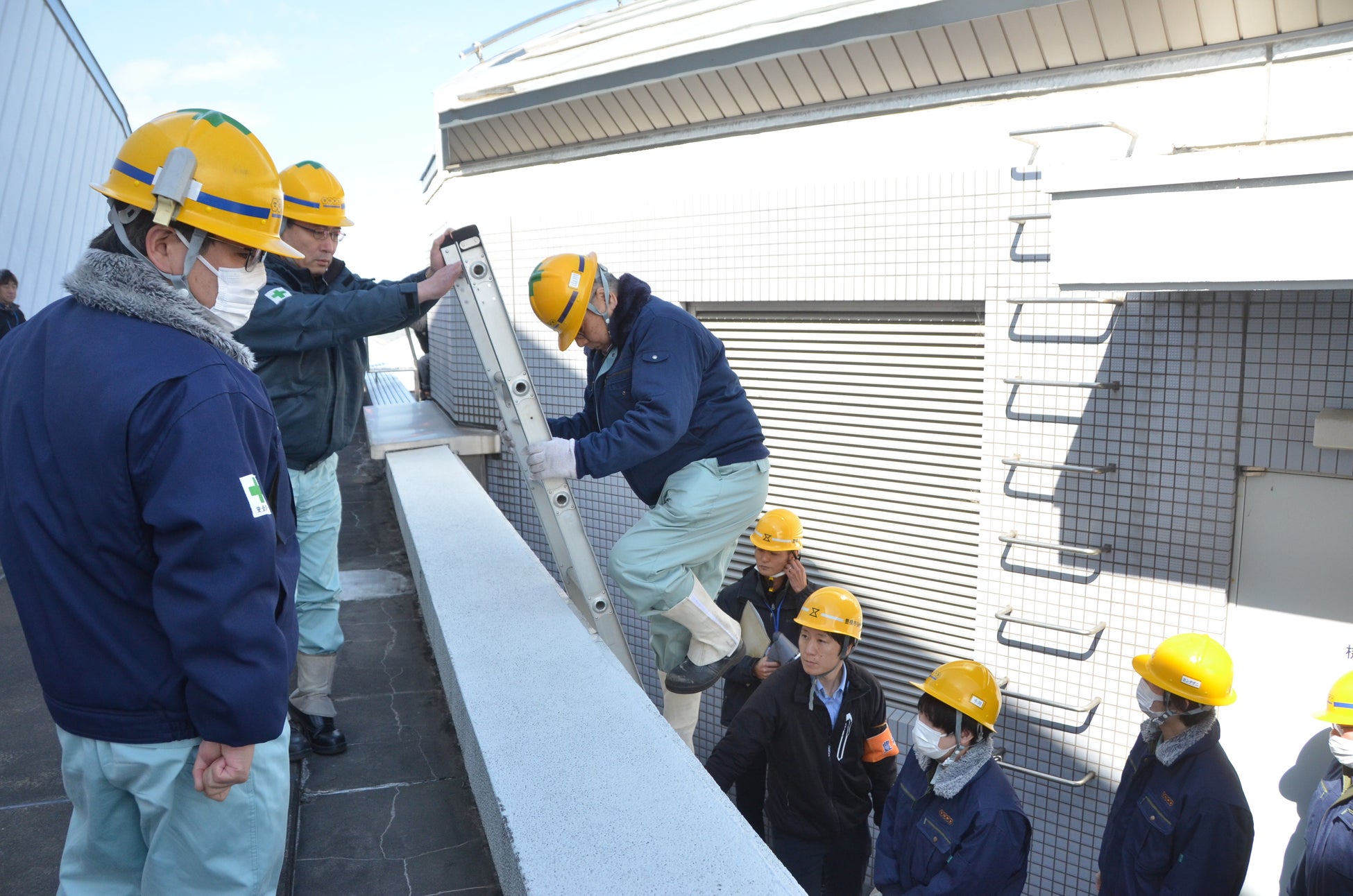 ライフポートとよはしでは、屋外階段を利用し、最後ははしごを使って高さ12メートルの屋上へ。