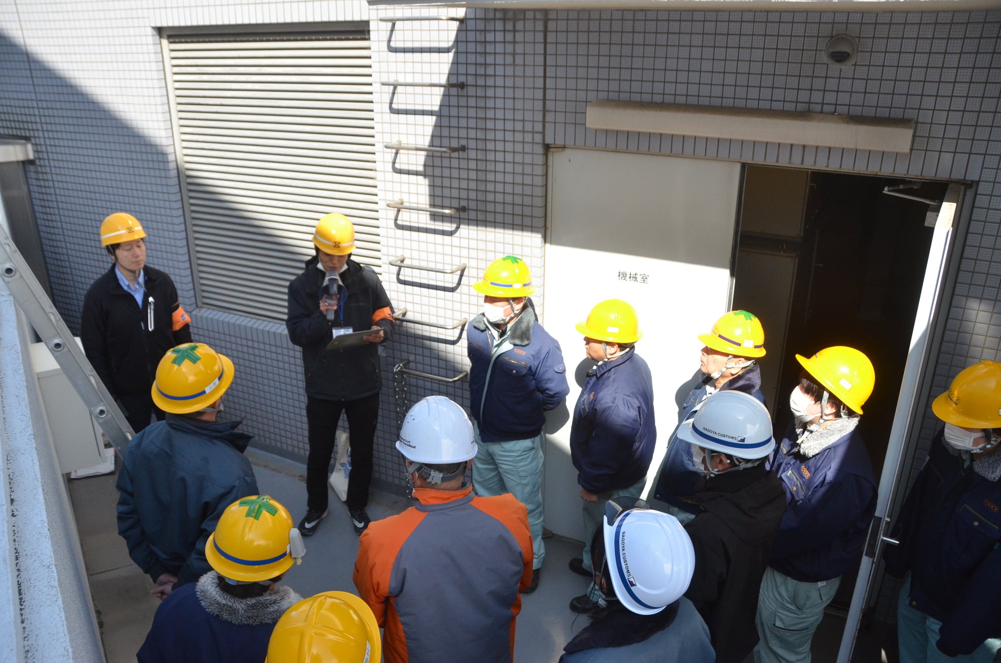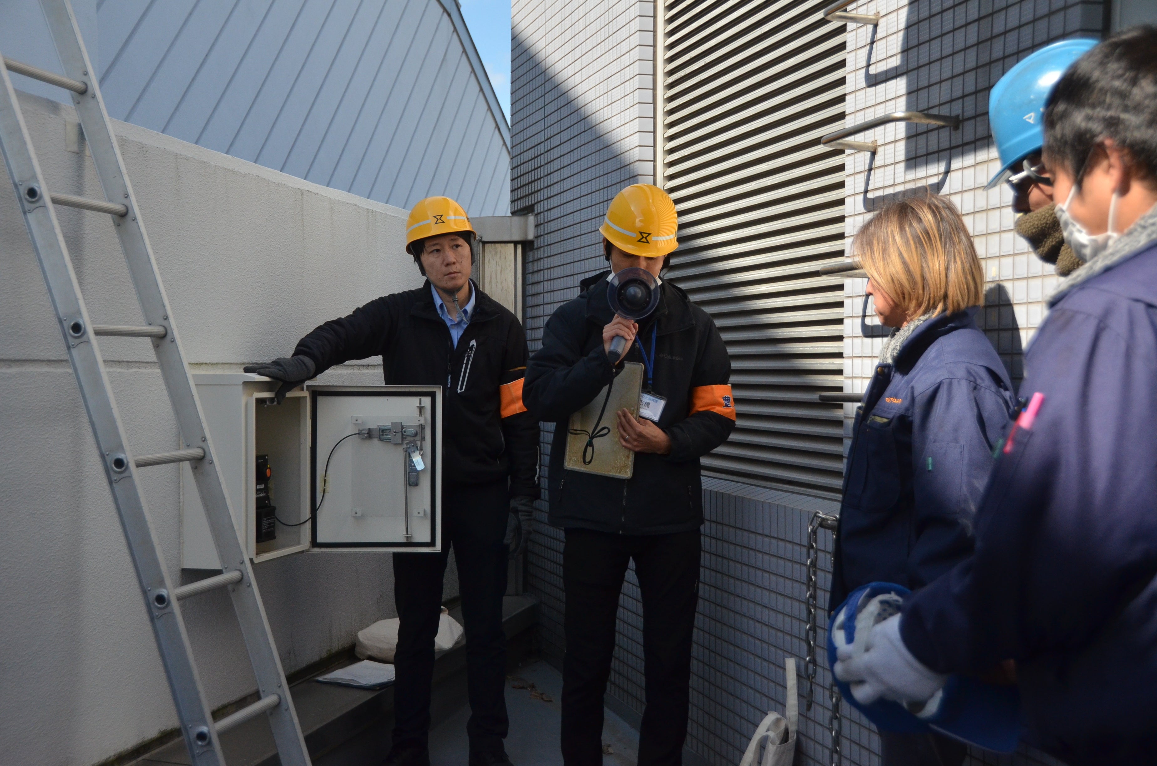 非常時には「地震自動解錠鍵ボックス」を開けて、はしごを設置する必要があるため、操作や屋上へのはしご設置手順について、豊橋市役所みなと振興課の職員から説明を受けました。