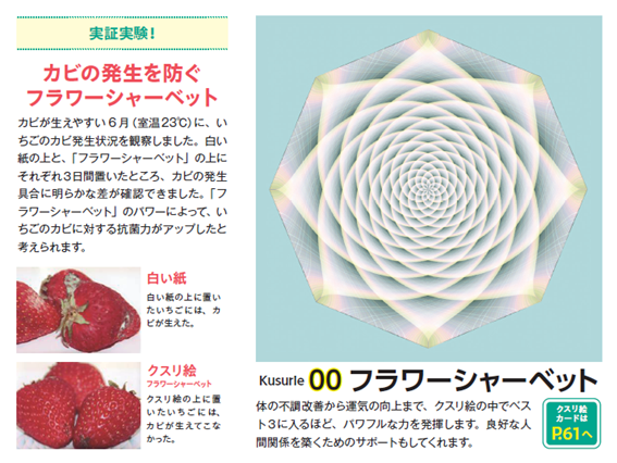 世界にある形にはパワーがあり、なかでも誰もが美しいと感じる図形には、強大なパワーがあります。それらの形を活かして、クスリ絵はつくられています。例えば、螺ら旋せんや渦うず、回転する形、集中、放射、動きのある形(メビウス)、黄金比でできている流線形、シンメトリーなどのバランスのよい安定した形、曼まん陀だ羅ら、数学的な理論が背景にある形、神しん聖せい幾き何か学がく模様などです。どれも誰もが美しいと感じる形ばかりです。特に有名な「フラワー・オブ・ライフ( FフォルOL)」は、この宇宙に存在するすべての形を生み出す根源ともいうべき神聖な図形で、このFOLから多くのクスリ絵が開発されています。