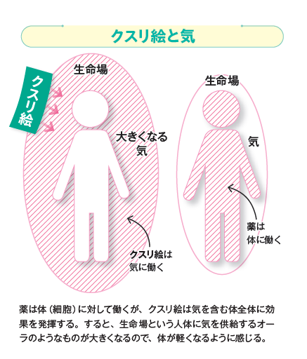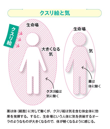 クスリ絵は、触れたり洋服の上から貼って使うことで、人間の周りを取り囲む目には見えない生命場(オーラ)に働きかけ、その人の自然治癒力を高めます。生命エネルギー自体が活性化されるので、さまざまな不調が消えると考えられています。体は潜在意識がコントロールしているので、自分の中に潜む潜在意識に働きかけることが、不調を消し、運気を上げる方法のひとつであると丸山先生は考えています。クスリ絵を眺めたり、触れたりするだけで、いつの間にか潜在意識が、自分が思い描く願いを叶えてくれようとするのです。