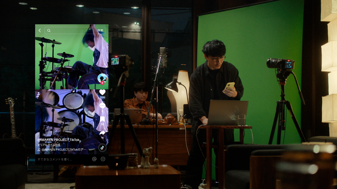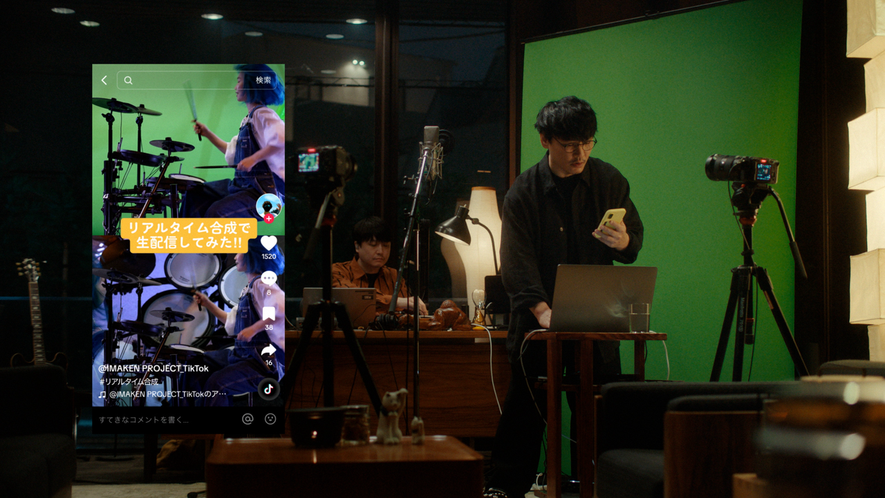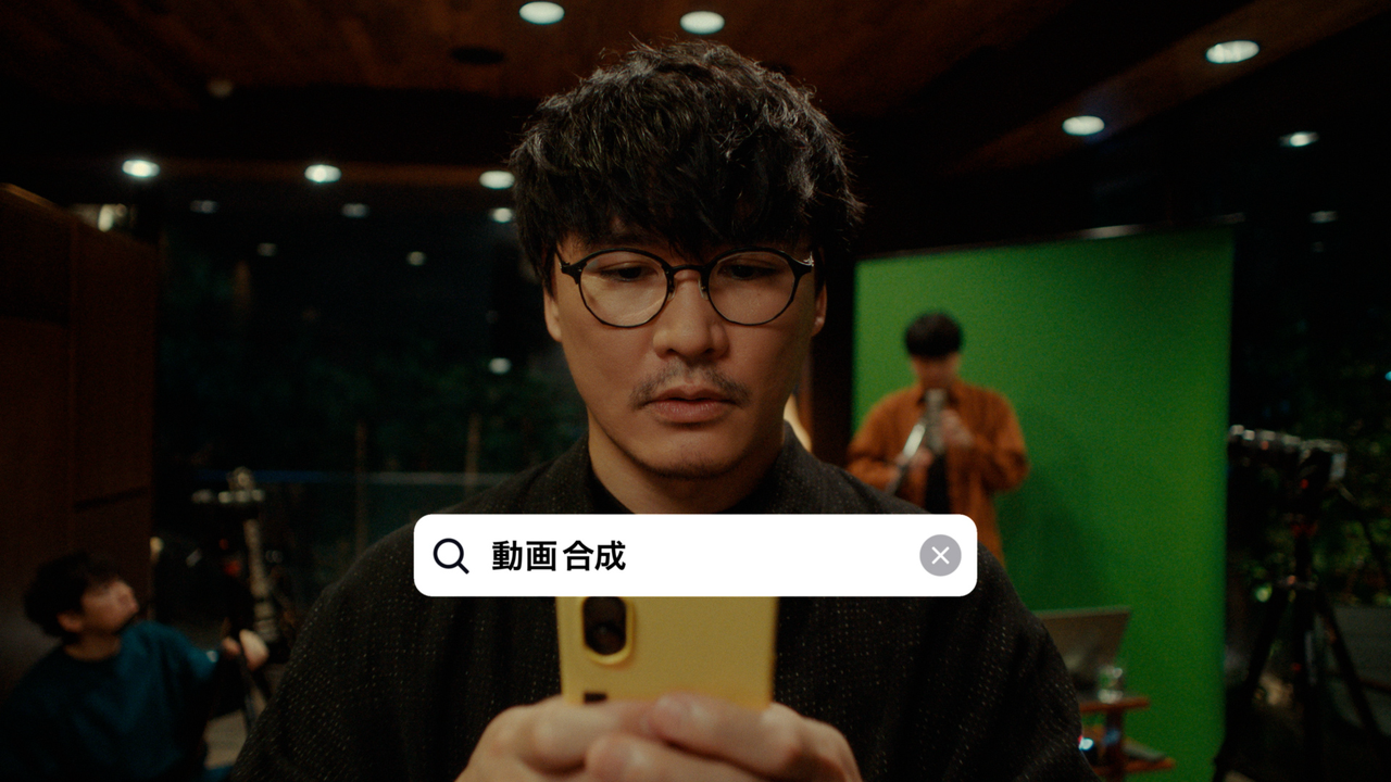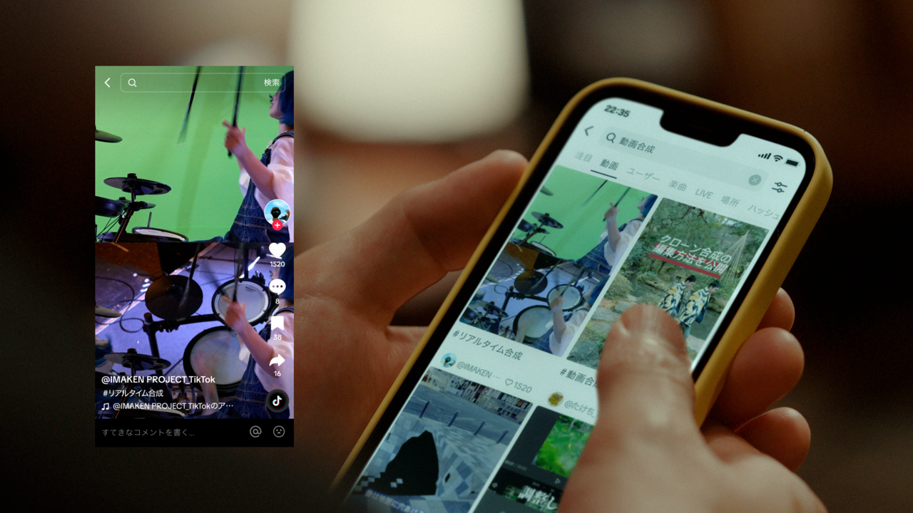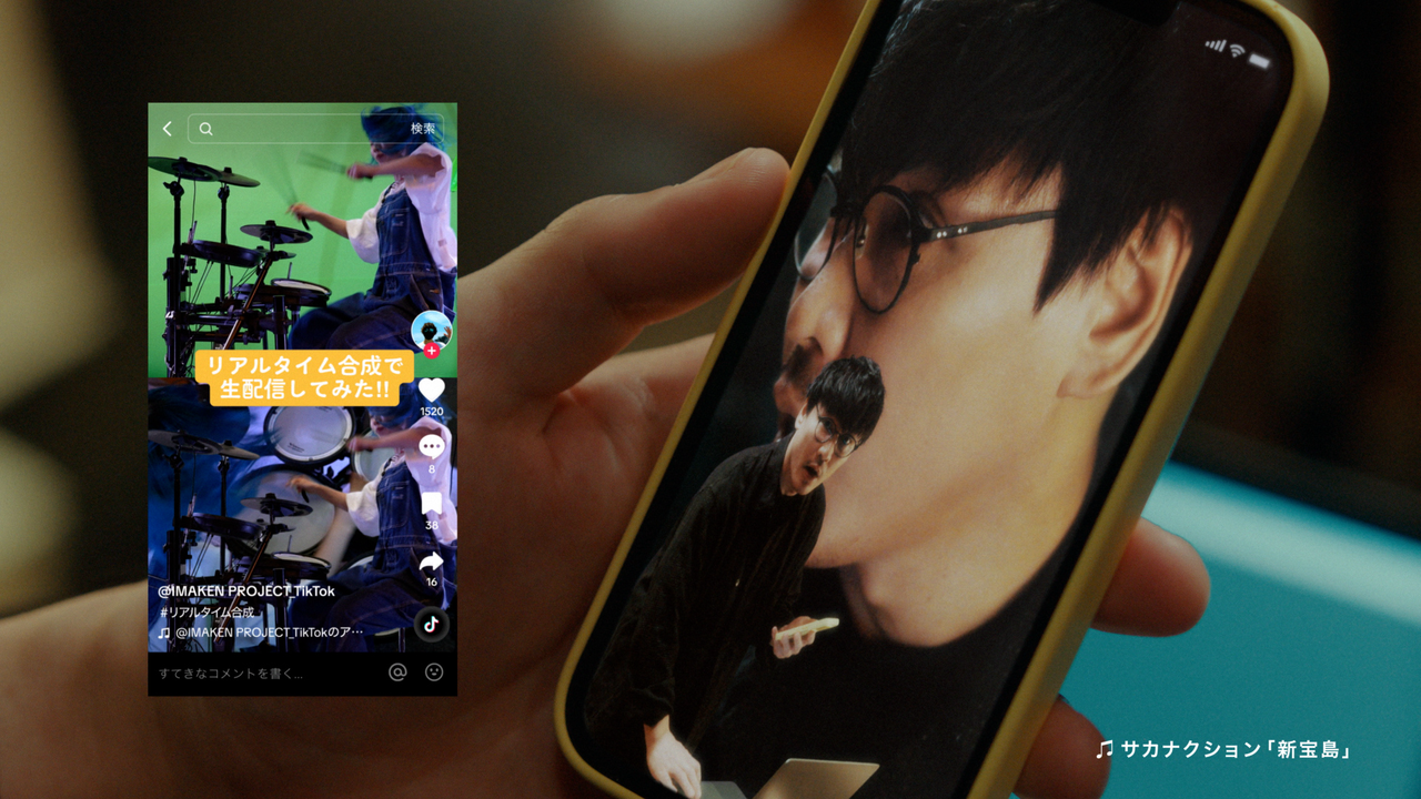 TikTokで検索をする山口一郎さん。最近の音楽活動の中で気になっていた「動画合成」を検索し、TikTok上の様々な動画合成のアイデアを眺めます。その中で、TikTok LIVEを始めとしたライブ配信で活かせる動画合成方法を学べるTikTok動画を発見。分かりやすいTikTok動画を参考にしながら、実際にご本人のライブ配信にそのアイデアを取り入れることに。山口さんの「よし、じゃあ、やろう!」を合図に、リアルタイムでの動画合成をしながら、いつもと違う、ユニークで山口さんらしい音楽配信に挑戦しながら、「TikTokで検索したら、僕が変わった」を体現しています。