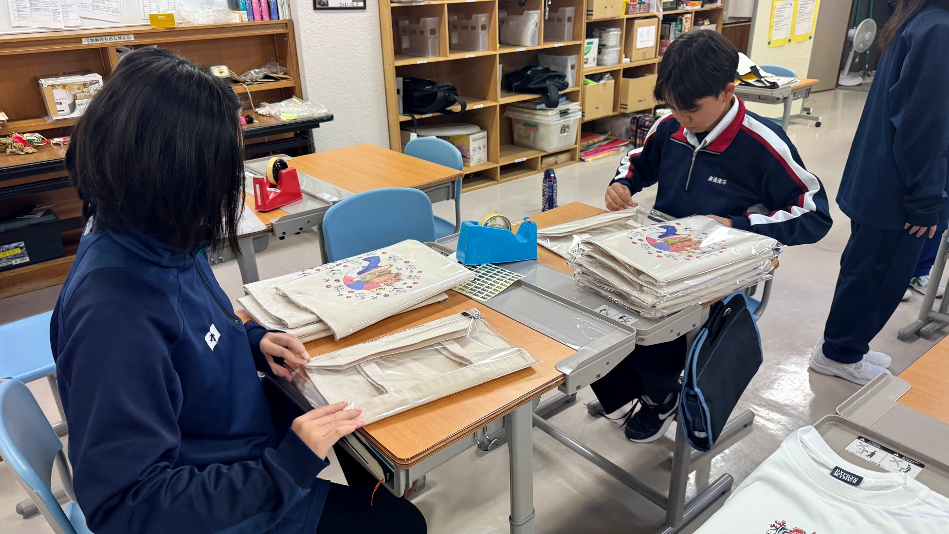 今回は、沖縄市立教育研究所協力のもと、沖縄市内の中学生5名がオリジナルのキングスグッズ製作に挑戦しました。子どもたちは、実際にアリーナショップを見学して、キングスの職員と商品開発会議を重ねながら、「沖縄市」や「琉球ゴールデンキングス」をテーマとしたデザインを考案し、4種類のアイテムを製作しました。また、納品された商品の梱包作業も子どもたち自身で行い、発売日に向けて準備を整えています。