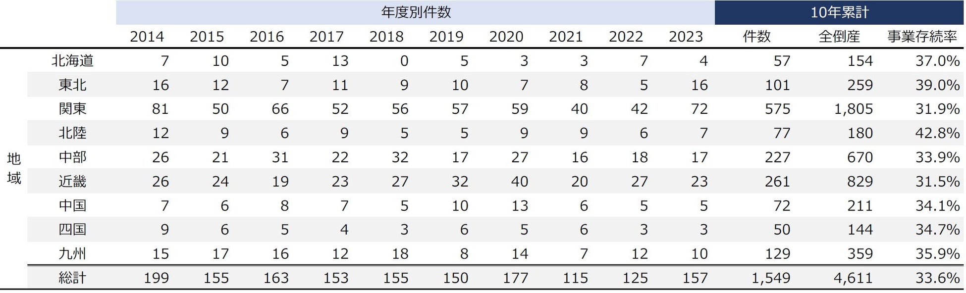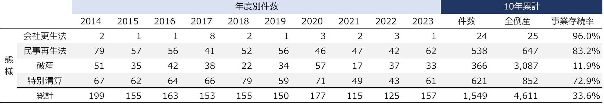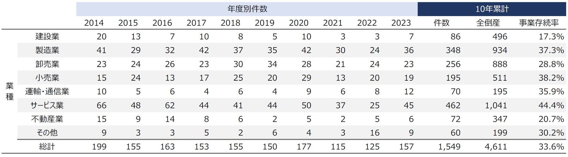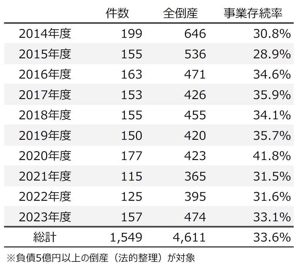 2023年度は157件判明、事業存続率は33.1%。2年連続で件数、事業存続率ともに上昇