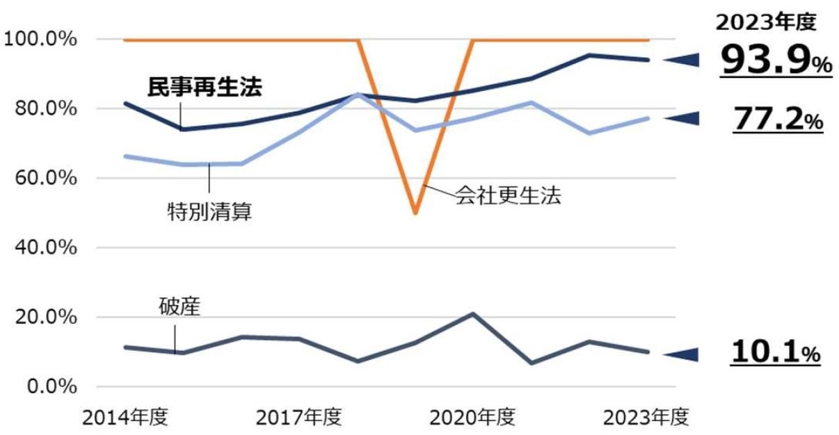 事業存続率では、「会社更生法」が96.0%(25件中24件)と高く、過去10年間で事業が存続できなかったのは1件にとどまる。「民事再生法」も83.2%と高水準で、過去10年間の事業存続率は概ね上昇基調であり、2022、2023年度はいずれも90%台を上回っている。近年、金融機関主導あるいは再生ファンドが積極的に関わるプレパッケージ型・民事再生の積極的な活用が背景にあると考えられる。