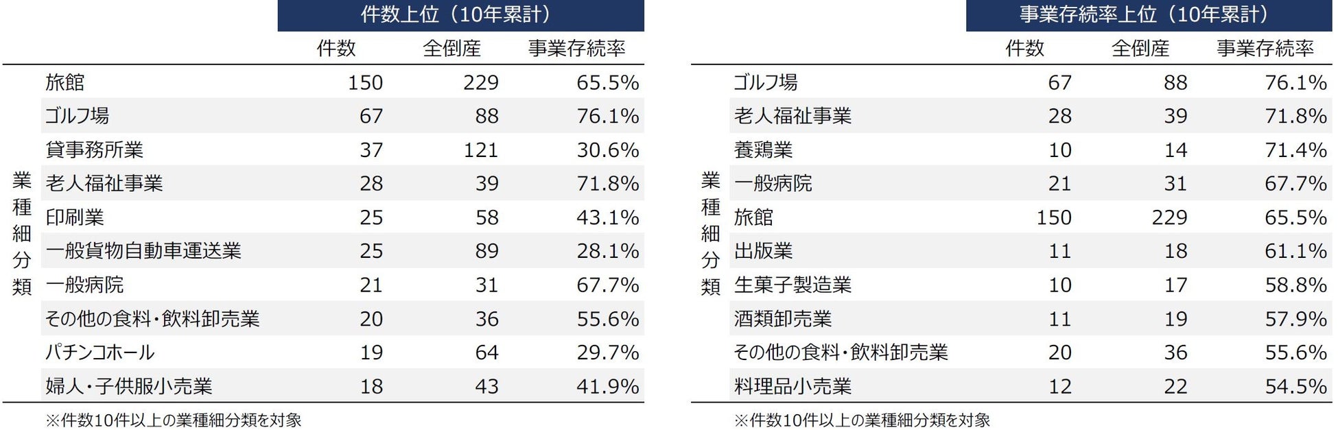 業種細分類で見ると、過去10年間の累計で件数が最も多かったのは「旅館」の150件。2番目の「ゴルフ場」67件や、続く「貸事務所業」37件と比べても突出している。また、「旅館」は負債5億円以上の全倒産で見ても最多(229件)であり、過大な債務を抱えやすい業種である半面、宿泊施設やブランドには一定の価値が認められ、事業存続しやすいものと考えられる。