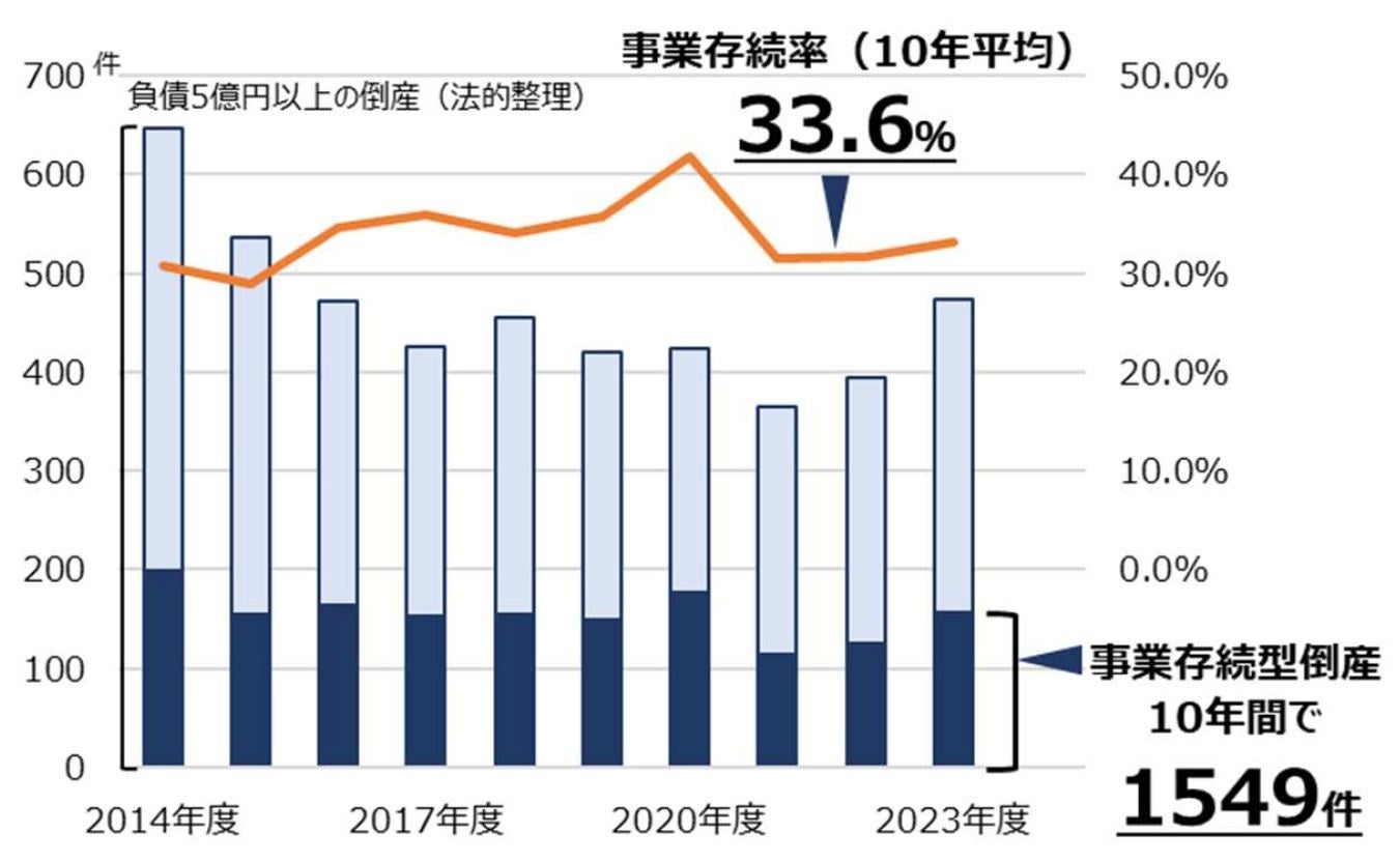 「事業存続型倒産」は、2014年度から2023年度の10年間で1549件。同期間に発生した負債5億円以上の倒産(4611件)に占める割合(※本稿では「事業存続率」と表記)は33.6%にのぼる