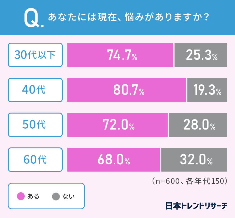 各年代を平均するとおよそ7割以上の方が、「現在悩みがある」と答えています。