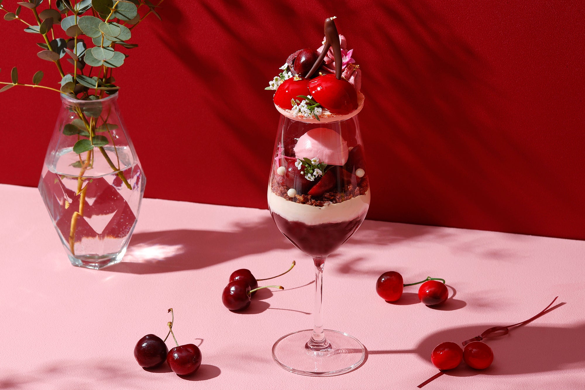 「チェリールージュパフェ」は、甘酸っぱいチェリーの贅沢な味わいに、芳醇なキルシュと赤ワインがアクセントとなった大人の味わいの一品です。グラスの中には、さくらんぼシャーベットを中心に、フレッシュチェリーとキルシュでマリネしたチェリー、エディブルフラワー、パールクラッカンを添えました。その下層にはチョコレートクランチ、アールグレイシャンティ、芳醇な赤ワインとグリオットチェリーのジュレを重ね、まるでアートのような美しいレイヤーを演出。ピンク色のマカロン生地で蓋をしたグラスのトップには、さくらんぼを象ったチェリームースをあしらい、チェリーのガナッシュモンテ、フレッシュなアメリカンチェリー、エディブルフラワー、金箔で彩りました。
