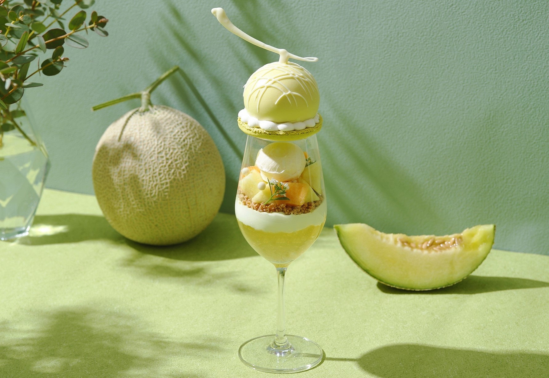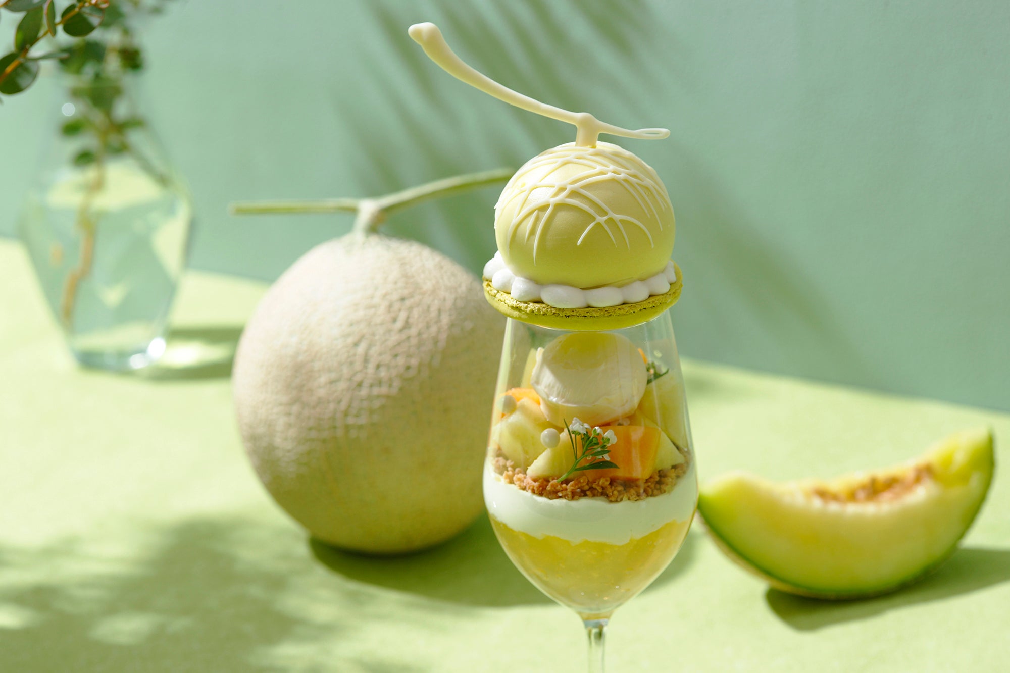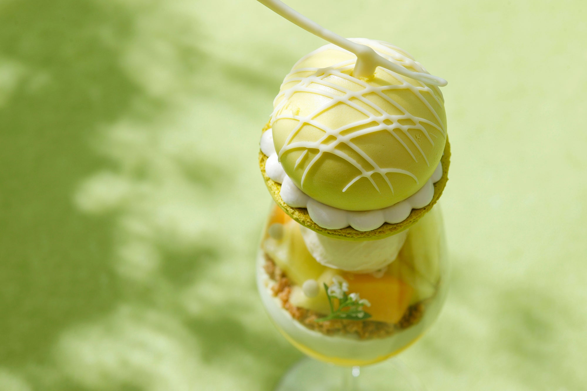 「メロングレイスパフェ」は、赤肉と青肉2種のフレッシュメロン、華やかなライチの香りとマスカルポーネのまろやかなコクが見事に調和し、爽やかな味わいをお楽しみいただけます。グラスの中には、コク深いマスカルポーネアイスクリームを中心に、エディブルフラワー、パールクラッカン、瑞々しいフレッシュな赤肉と青肉のメロンをあしらいました。その下には、ホワイトチョコレートクランチ、メロン風味のシャンティ、華やかな香りが贅沢な高揚感を演出するライチ&メロンジュレをレイヤー状に重ねました。淡いグリーンのマカロン生地で蓋をしたグラスのトップには、メロンをモチーフにした、メロンとマスカルポーネのムースを大胆にのせました。ムースの中には赤肉メロンのジュレを忍ばせ、周りにシャンティを絞って可愛らしいフォルムに仕上げました。さらに、完熟フレッシュメロンが付いたセットもご用意し、果実の魅力を存分にご堪能いただけます。