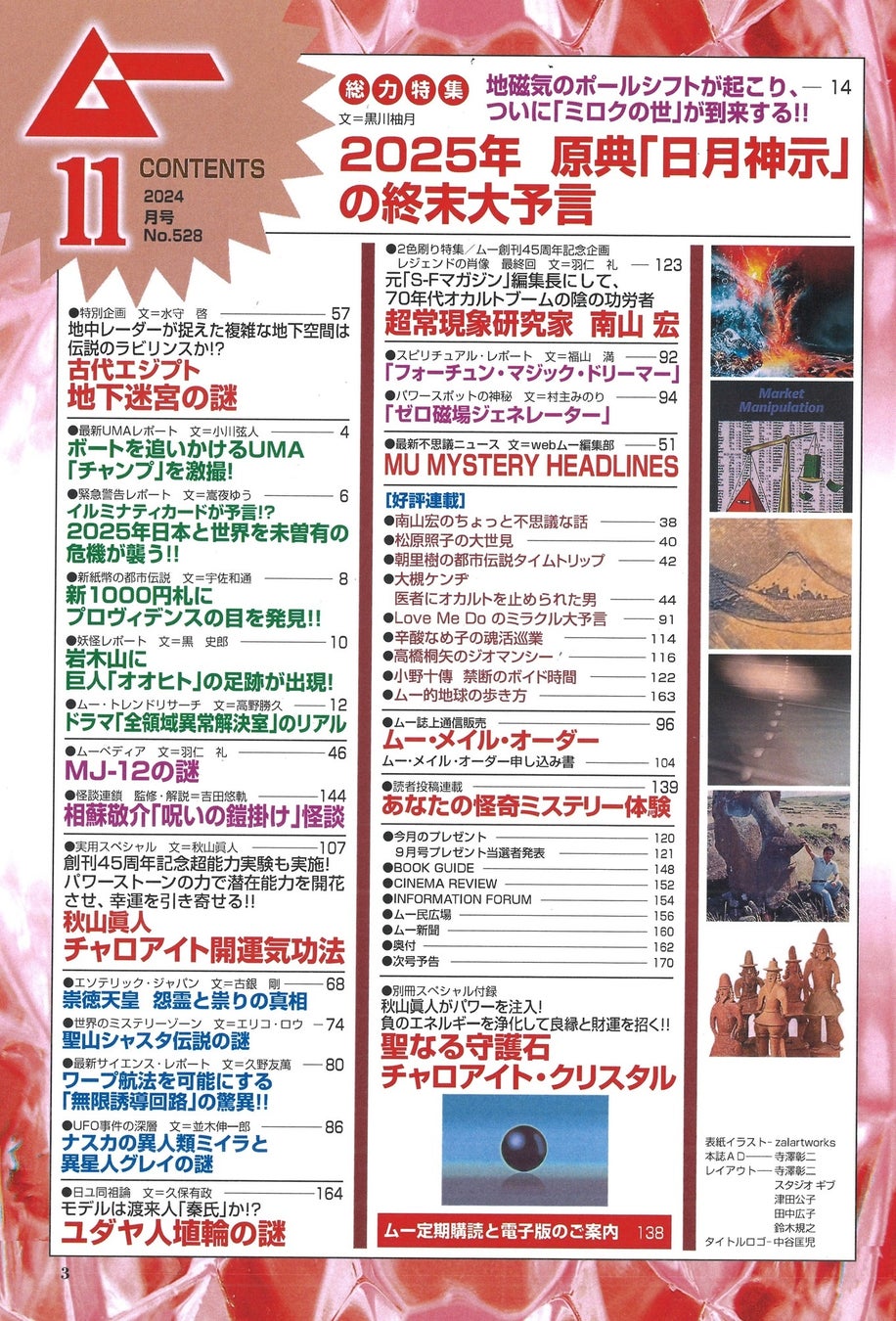 2色刷り特集 超常現象研究家 南山 宏/実用スペシャル 秋山眞人 チャロアイト開運気功法/別冊スペシャル付録 聖なる守護石チャロアイト・クリスタル/崇徳天皇 怨霊と祟りの真相/聖山シャスタ伝説の謎/ユダヤ人埴輪の謎/新1000円札にプロヴィデンスの目を発見‼/ナスカの異人類ミイラと異星人グレイの謎/ほか