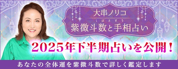 人気占いバラエティ番組出演で今大注目の鑑定士・大串ノリコが監修する、紫微斗数(しびとすう)と手相占いに特化したスマホ専用月額占いサイト『大串ノリコ 紫微斗数と手相占い』。現在『2025年下半期の運勢|あなたの全体運を大串ノリコが紫微斗数で鑑定』を無料で公開中です。この機会にぜひご利用ください。