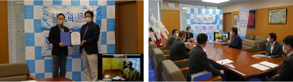 日本中に残された海にまつわる民話を発掘し、その民話のストーリーと、そこに込められた「想い」「警鐘」「教訓」を、親しみやすいアニメーションとして映像化します。当日は、ゼネラルプロデューサーをはじめとする事務局メンバーが「海ノ民話のまち」として認定した15のエリアのうちの1つである山口県岩国市の福田良彦市長を表敬訪問し、「海ノ民話のまち」認定証贈呈式を行いました。※ゼネラルプロデューサーはオンライン参加。