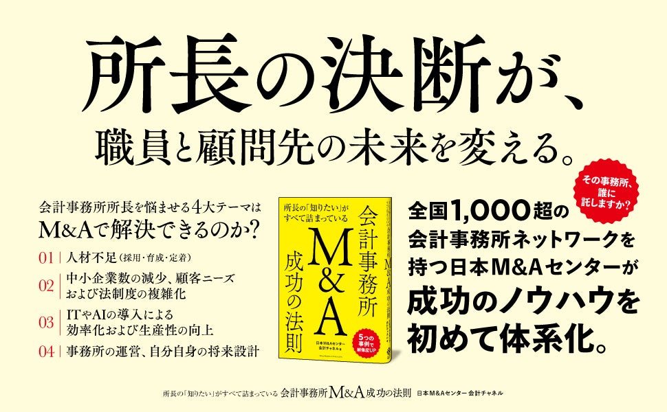 ビジネス書や実用書を中心に出版する株式会社クロスメディア・パブリッシング(本社:東京都渋谷区、代表取締役社長:小早川幸一郎)は、2026年2月13日に書籍『所長の「知りたい」がすべて詰まっている 会計事務所M&A成功の法則』(日本M&Aセンター 会計チャネル)を刊行しました。