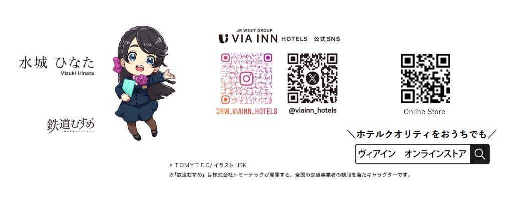ヴィアインホテルズの客室で使用されているオリジナルインバス、オリジナルルームウェア(一部店舗)、ヴィアインホテルズの鉄道むすめ(※)水城 ひなたグッズなど、ヴィアインホテルズオンラインストアで好評販売中の商品を店頭で販売いたします。