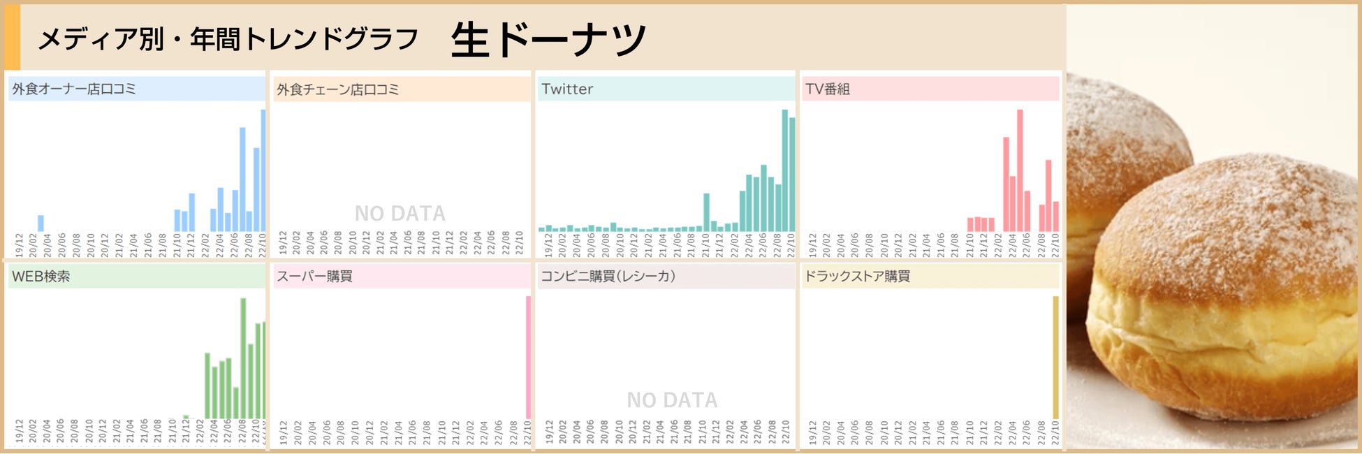 その他、同じ「生ドーナツ」カテゴリのボンボローニ(2022年間ランキング16位)や韓国のツイストドーナツとして若者を中心に人気を集めた「クァベギ」など、ドーナツ人気が高まった1年となりました。2022年に入り、口コミ・Twitterが伸び、TV番組でもよく取り上げられていることが分かります。