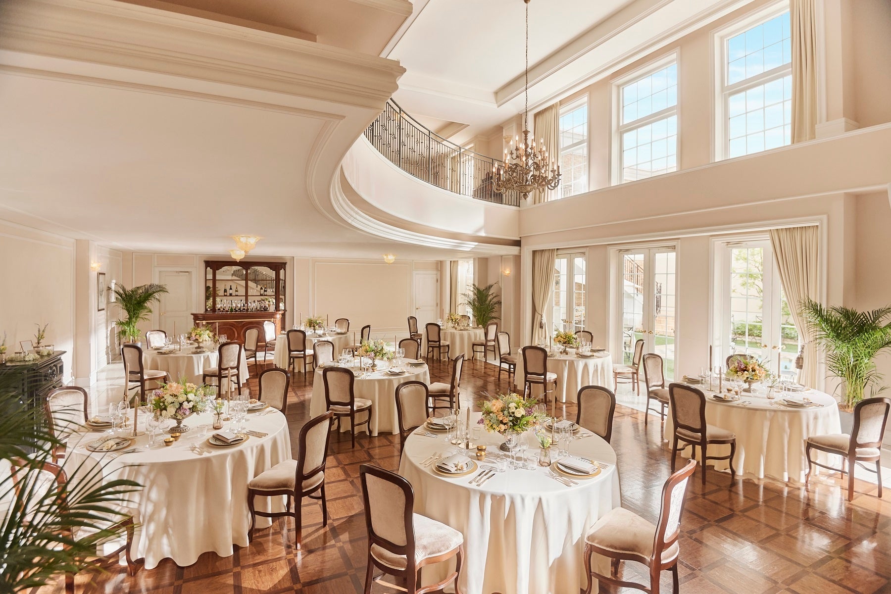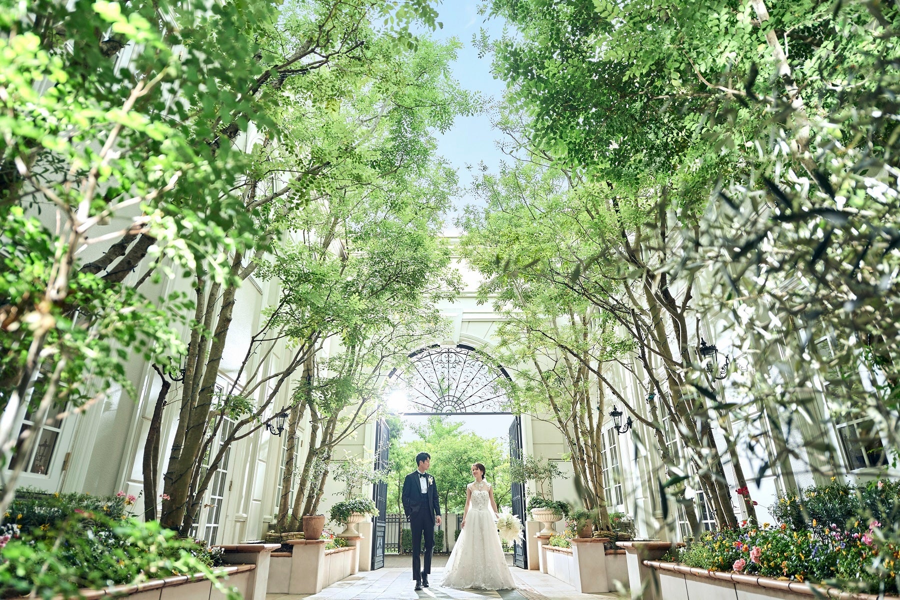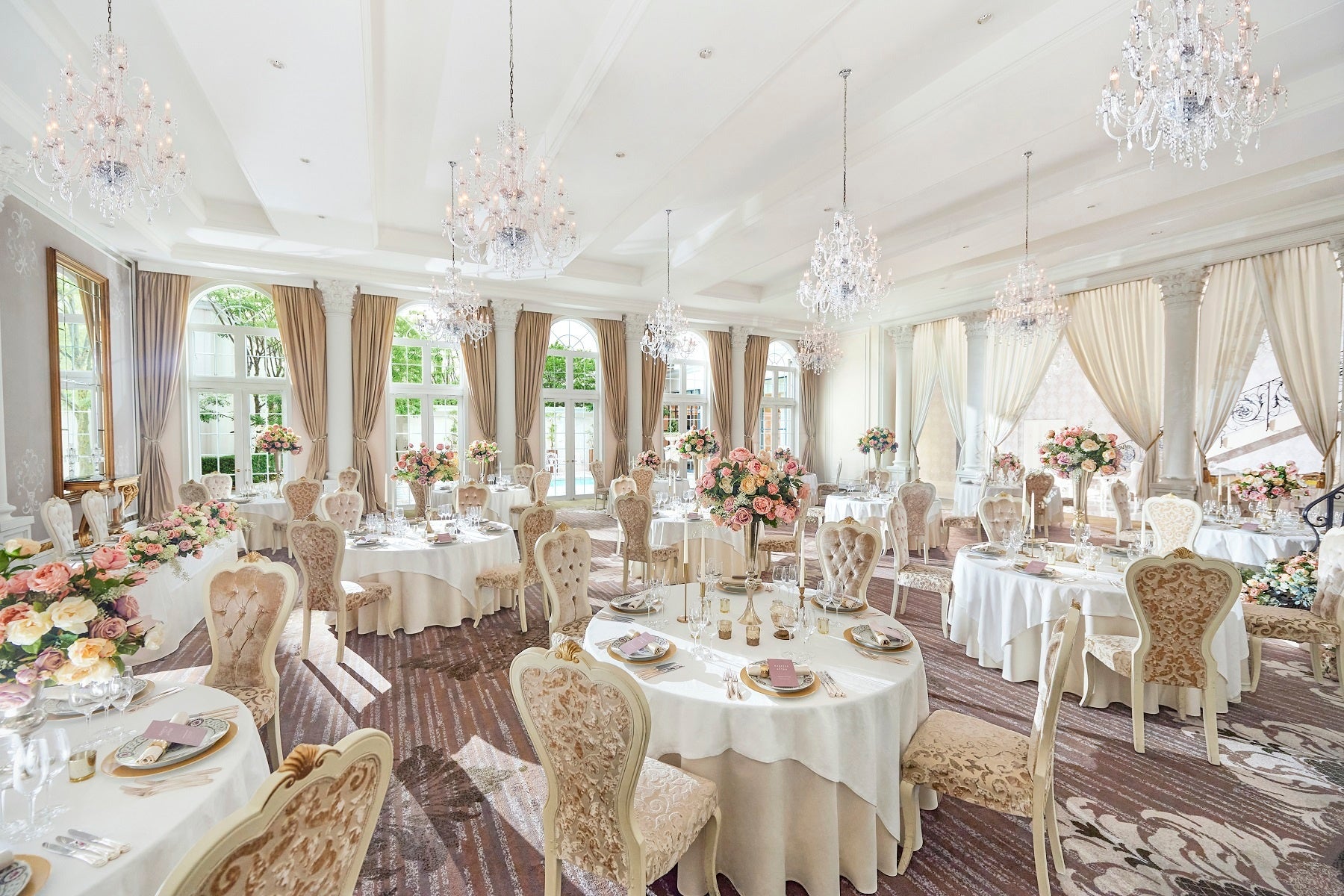 白亜の外観が美しいプールガーデン付きの会場。洗練されたシャンデリアとシックなトーンで統一された調度品が揃う大人かわいい空間。外には華やかな演出がぴったりの緑豊かなプール付ガーデンが広がります。