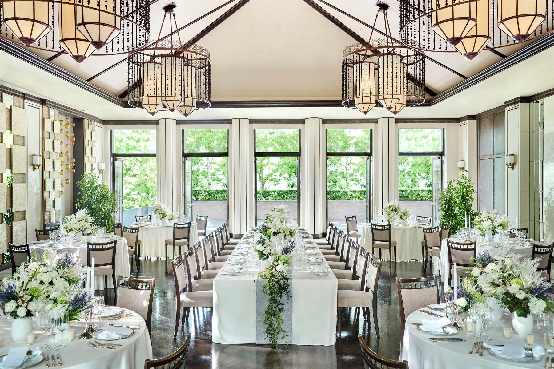 シンプルながら上質さと個性が融合した京都らしい邸宅。ドレススタイルの他、燈籠をモチーフにしたシャンデリアなどの和モダン風インテリアが和の装いにも良く映えます。テラス・ダイニング・リビングが一続きになった自由度の高い空間で個性が光るパーティを楽しめます。