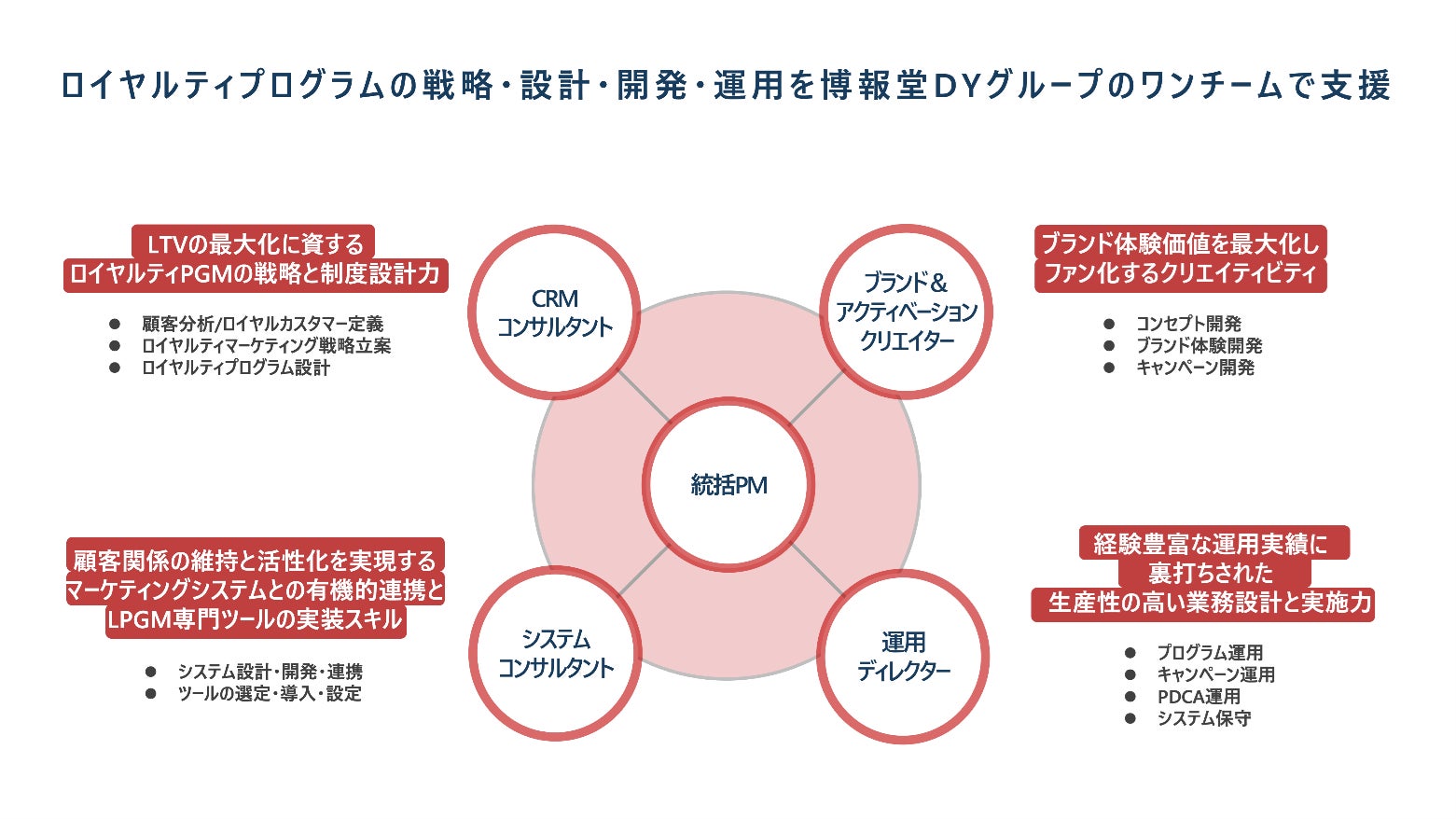 ロイヤルティプログラムの戦略・設計・開発・運用に対して、博報堂DYグループの各専門家で編成するチームに、ブランドクリエイティブやアクティベーションクリエイティブの実績があるクリエイターが参画します。制度設計・システム開発・運用に求められる品質や信頼を担保しつつ、顧客にプログラムへの積極的な参加を促し、感情を動かす体験のクリエイティブで“ブランドラブ”を醸成するプログラムを実現します。