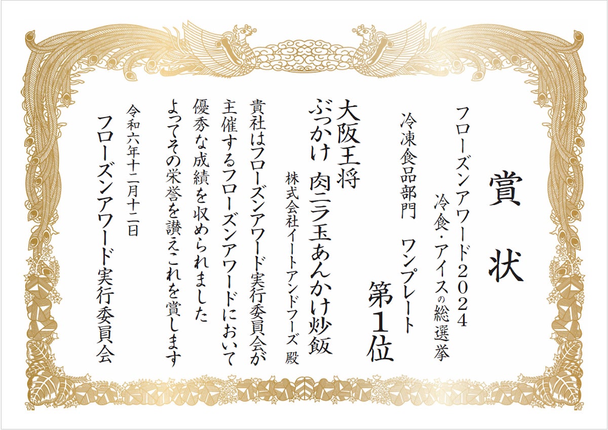 株式会社イートアンドフーズ(東京ヘッドオフィス:東京都品川区 代表取締役社長:仲田浩康)は、株式会社日本アクセス様が主催する冷凍食品・アイスクリームの人気ナンバーワンを決める総選挙「フローズンアワード2024」において、『大阪王将 ぶっかけ 肉ニラ玉あんかけ炒飯』が冷凍食品ワンプレート部門第1位を獲得したことをお知らせいたします。